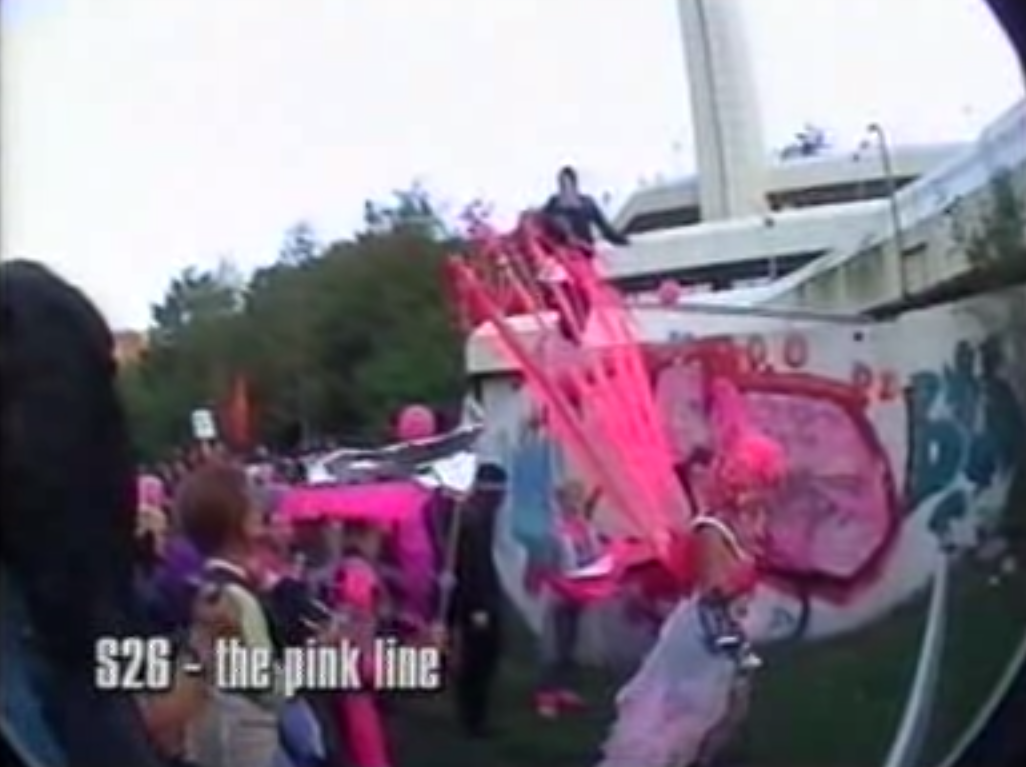En este segundo vídeo, que podéis ver y descargar aquí, se recoge el trabajo del bloque rosa que se desarrolló para la cumbre anual del Banco Mundial y del Fondo Monetario Internacional el año 2000 en Praga. Ya había escuchado hace tiempo de este ‘cuerpo rosa’ de resistencia que operaba a primera línea de la manifestación, pero en este documento se puede entender toda la estrategia que hay detrás de esta brillante idea para la toma del espacio público y su reivindicación.