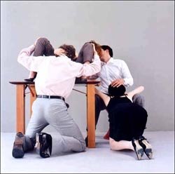 Dans Pornographie, les modèles miment des scènes inspirées de revues pornographiques. Mais ils sont habillés, et leurs visages, lorsqu’on les voit, sont impassibles. L’objet du désir étant caché, l’obscénité de la scène se dissout, et laisse la place à une chorégraphie aussi explicite que décalée. Les effets de ce masquage sont multiples. Absurdité : des personnages s’efforcent d’exécuter un acte érotique impossible. Inquiétude : l’impassibilité des modèles transforme le plaisir en une froide mécanique. Excitation : l’objet caché peut se révéler plus fantasmatique que l’objet vu. Esthétique : la pornographie, devenue une équation de gestes, révèle son potentiel chorégraphique. » (http://www.loevenbruck.com/artist.php?id=leve&view=bio)