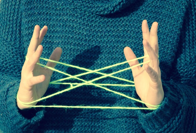 Tener una cuerda para dibujar en el espacio con otra persona, a la vez que conversamos. Una cuerda que conforma dibujos y termina por deshacerse para seguir siendo una cuerda.