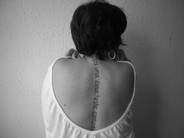 Después de morir mi madre, mi hermana pequeña se hizo tatuar una frase que ella decía en momentos muy especiales “saps una cosa? estic contenta” (¿sabes una cosa? estoy contenta), desde las últimas cervicales bajando por la espalda, siguiendo la línea de la columna vertebral.