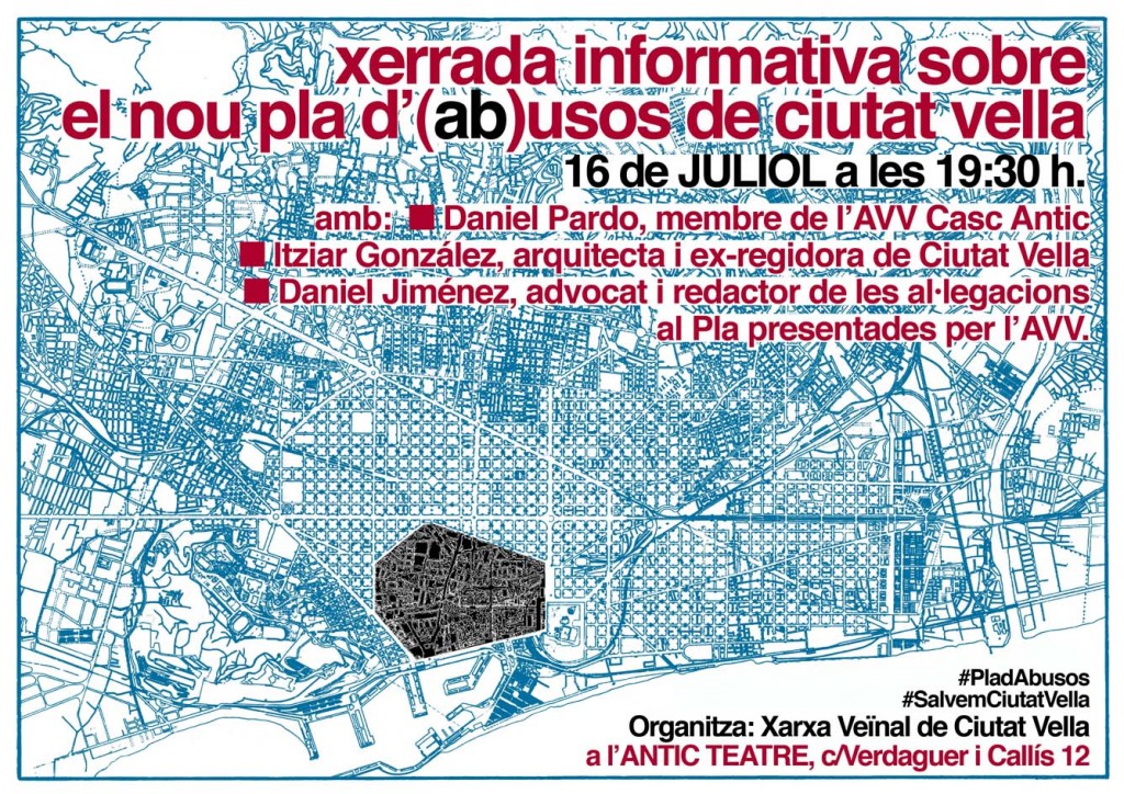 El próximo martes 16 de julio a las 19:30 CET TVtron retransmitirá en colaboración con el Antic Teatre de Barcelona una charla informativa sobre el nuevo plan de abusos de Ciutat Vella que tendrá como invitados a Daniel Pardo, miembro de la AVV Casc Antic, Itziar González, arquitecta y ex-regidora de Ciutat Vella y Daniel Jiménez, abogado y redactor de las alegaciones al Plan presentadas por la AVV.