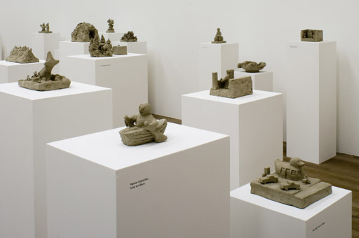 y las 60 esculturas de arcilla sin cocer de la colección «suddenly this overview»(60 x 70 x 50 mm y 820 x 830 x 50 mm)