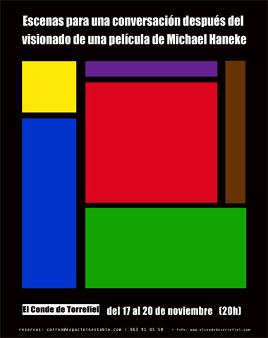 Escenas para una conversación después del visionado de una película de Michael Haneke se compone de diferentes escenas sin ningún nexo entre ellas. El orden es arbitrario así como su selección. Para la presentación en Valencia hemos elegido 11 escenas de las 20 pensadas. La idea también es esa: según el momento y el lugar, hacer una selección y, si la situación lo requiere, componer nuevas.