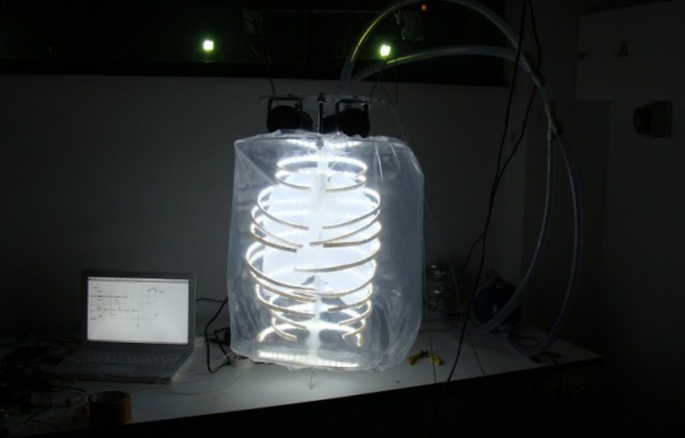 Thoughout Breathing es una máquina de respiración interactiva que acompaña, amplifica y expande el acto de respirar. Esto performa una nueva forma de experimentar la respiración, expandido a través de una interface y del espacio.