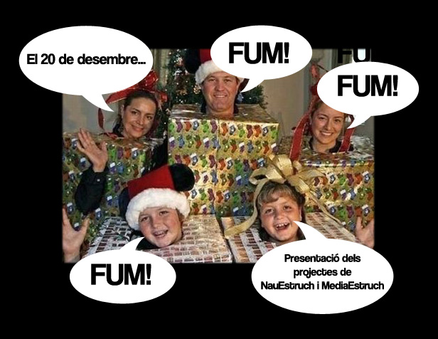 FUM! FUM! FUM! es una jornada de presentación de los proyectos en residencia en MediaEstruch y a NauEstruch lo largo de esta pasada otoño. MediaEstruch y NauEstruch son los departamentos de la Fábrica de Creación de Artes en Vivo L’Estruch orientados a los nuevos formatos de creación performática y multimedia . Una tarde entera donde conocer proyectos multimedia, visuales, performáticos, educativos, urbanísticos y de danza y tecnología. Una mirada a la producción visual, performática y multimedia contemporánea , de la mano y de la viva voz de los propios artistas . Una celebración pre-navideña en compañía de los artistas residentes en el Estruch.