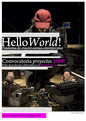 Los talleres de producción escénica colaborativa en Medialab-Prado previstos para el segundo semestre de 2009 están dirigidos a la producción de una serie de espectáculos de pequeño formato que se centren en el uso de las nuevas tecnologías y la performance contemporánea. También se contempla su posterior muestra en un ciclo teatral o inclusión en los circuitos escénicos.Desde hace un par de años trabajamos por crear una plataforma de creación de artes escénicas y nuevas tecnologías sobre concepto como la innovación y la convergencia con programas similares fuera de nuestras fronteras que son campo de trabajo habitual o más o menos desarrollado.En esta presentación se habla de cómo se llevarán a cabo los talleres, sus condiciones, la convocatoria, pero se dedicará un espacio a describir el modo de trabajo de Medialab-Prado. Marcos García nos hablará de Interactivos?, modo de trabajo colaborativo y abierto que estructura estos talleres de producción.HelloWorld!, Creación escénica contemporánea y nuevas tecnologíasQué es HelloWorld!Desde Madrid para el mundo. Plataforma estable de creación centrada en la producción escénica y las nuevas tecnologías.Trabajamos en el Medialab-Prado, en el Teatro Pradillo, la galería Off Limits de Madrid. Montamos talleres, seminarios, hacemos convocatorias, ciclos teatrales, nos va la marcha, cacharrear y tomar cañas juntos después.El proyecto pretende impulsar el diálogo entre las nuevas tecnologías y las artes escénicas, considerando que, si bien fuera de nuestras fronteras hay una larga trayectoria en este tipos de obras, en nuestra ciudad sólo se encuentran trabajos relacionados con la instalación, el arte contemporáneo o los proyectos interactivos no dramatúrgicos. Se trataría pues de explorar las posibilidades escénicas de las nuevas tecnologías creando una plataforma de producción de proyectos de pequeño formato para teatro contemporáneo. Explorar las posibilidades en disciplinas como las artes de movimiento, el teatro de objetos, teatro infantil,...Estos talleres tratan de desarrollar una plataforma de trabajo y de desarrollo de proyectos dentro del marco de la labor del Medialab Prado y de HelloWorld!Los proyectos que se seleccionarán para su posterior desarrollo serán aquellos que aúnen las nuevas tecnologías y el trabajo escénico, constreñido a la performance contemporánea, las artes de movimiento, lo narrativo, lo visual, etc. Talleres centrados en el uso de openframeworks, Pure data, processing, OpenGl, realidad aumentada, metaverse, electrónica, aplicaciones robóticas, videojuegos e interactivas. Así mismo, la convocatoria plantear trabajar con creadores de artes escénicas, performers, coreógrafos, teatro visual y de objetos, y reflexionar sobre el espacio escénico, el espacio público y las formas narrativas que surgen de la interacción de ambas disciplinas.Esta es una labor de mediación, es decir: que aspira a fomentar el diálogo entre dramaturgos, actores, performers o coreógrafos e ingenieros, especialistas en hardware o software, etc. Para ello, el los talleres se articularán sobre el modo de trabajo colaborativo llevado a cabo por el Medialab desde su proyecto Interactivos: y se tramará sobre la selección de proyectos que versen sobre la creación escénica contemporánea y el uso de las nuevas tecnologías.Trabajaremos en colaboración con espacios escénicos y otras plataformas similares para la distribución de los espectáculos, como ciclo o por separado dependiendo de la calidad de éstos, por los canales escénicos de España y el extranjero.http://www.tea-tron.com/helloworldForo HelloWorld! en el Medialab Pradologo helloworld