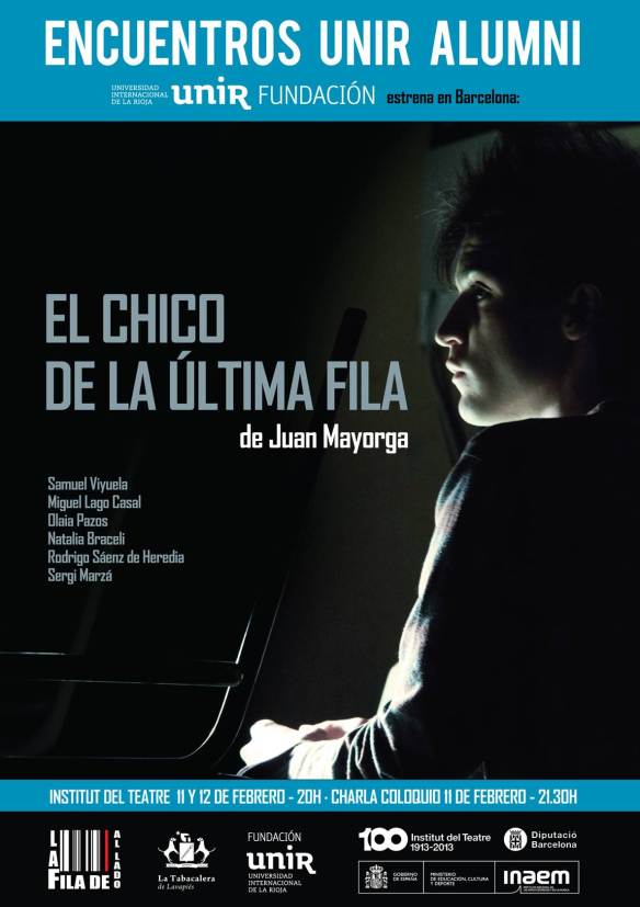 Dilluns 11 i dimarts 12 de febrer a les 20 hores el Teatre Ovidi Montllor de l’Institut del Teatre (Plaça Margarida Xirgu, 1) acull les funcions de l’espectacle ‘El chico de la última fila’ de Juan Mayorga, amb direcció escènica de Víctor Velasco i producció de La fila de al lado, amb la col·laboració de la Universidad Internacional de la Rioja (UNIR).