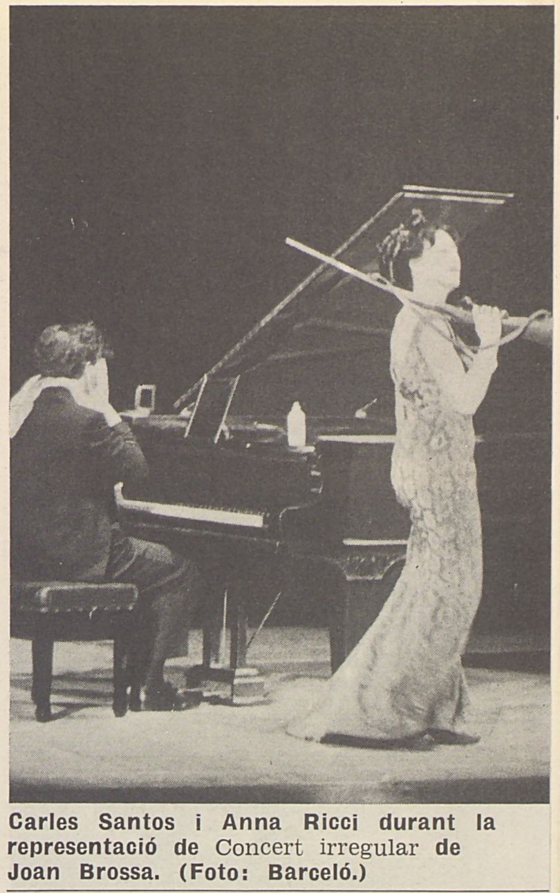 Según diversas fuentes, fue el éxito de la “Suite bufa” lo que empujó a Brossa a escribir el “Concert irregular”. Éste se presentaría por primera vez el 22 de julio de 1968 en la Fondation Maeght de Saint Paul de Vence para conmemorar el 75º aniversario de Joan Miró. El 7 de octubre de 1968 se mostró de nuevo en el Teatro Romea de Barcelona dentro del Ciclo de Teatro Latino y el año siguiente la pieza se representó en Nueva York por última vez. Aunque no tenemos noticia de ninguna grabación de vídeo, el guión de Brossa está publicado[5] y permite hacernos una idea bastante certera de la propuesta. Se trata de una “acción musical en dos partes”, donde cada parte consta de ocho escenas y cada escena constituye un sketch que subvierte el género del concierto.