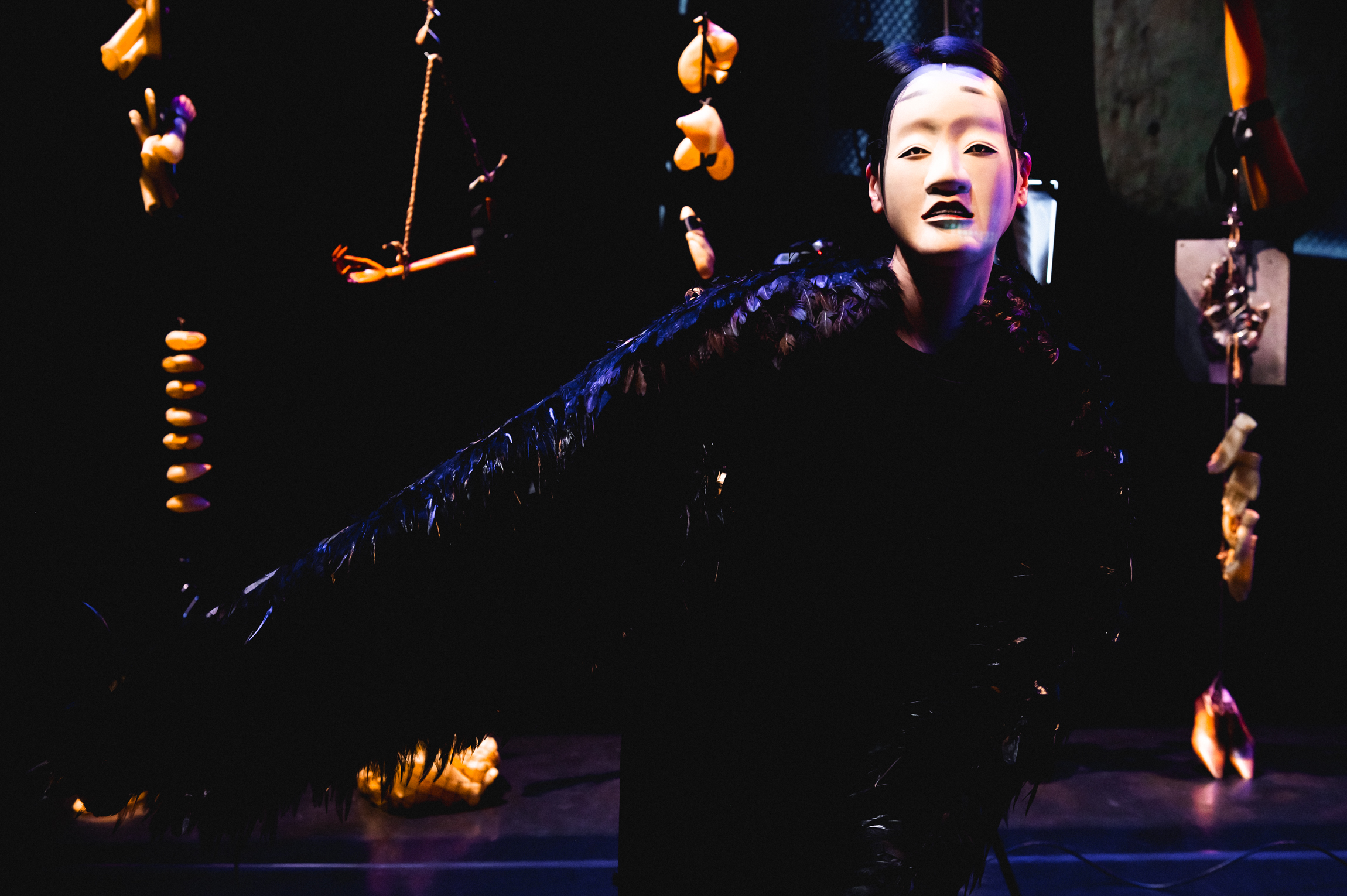 Fenómeno y fantasma tienen la misma raíz: phainein, lo que aparece. Así, las máscaras, las prótesis, los elementos en escena que en su mayoría son orgánicos y, por lo tanto,perecederos, pueden ser también ficción de la materia. El punto liminal entre el fantasma y la persona, es la consciencia de sus afectos y los actos que tiene sobre/desde ellos en su relación con el mundo. La máscara, ese lugar sonoro, bordea la posibilidad de ser fantasma o de encarnar el afecto para desnudarlo ante la otredad. La intimidad infinita que contiene el gesto/cara, el gesto/mano, el gesto/pie, el gesto/espalda, cabello, pelvis, pecho, música, música, música, notas, notas, silencio… El gesto/silencio. Esa intimidad infinita, es la que resguarda el acto de incorporar la máscara en el teatro y en nuestro intento de sobrevivir en la cotidianidad, cual uña enterrada haciéndose una con la carne. Llegar entonces al gesto/silencio, al gesto/pausa, nos llevará a desencarnar la madera, el barro, la porcelana o el metal de dicha máscara sobre nosotros, la cual además fue labrada por una singularidad que buscó eternizar esa mueca.