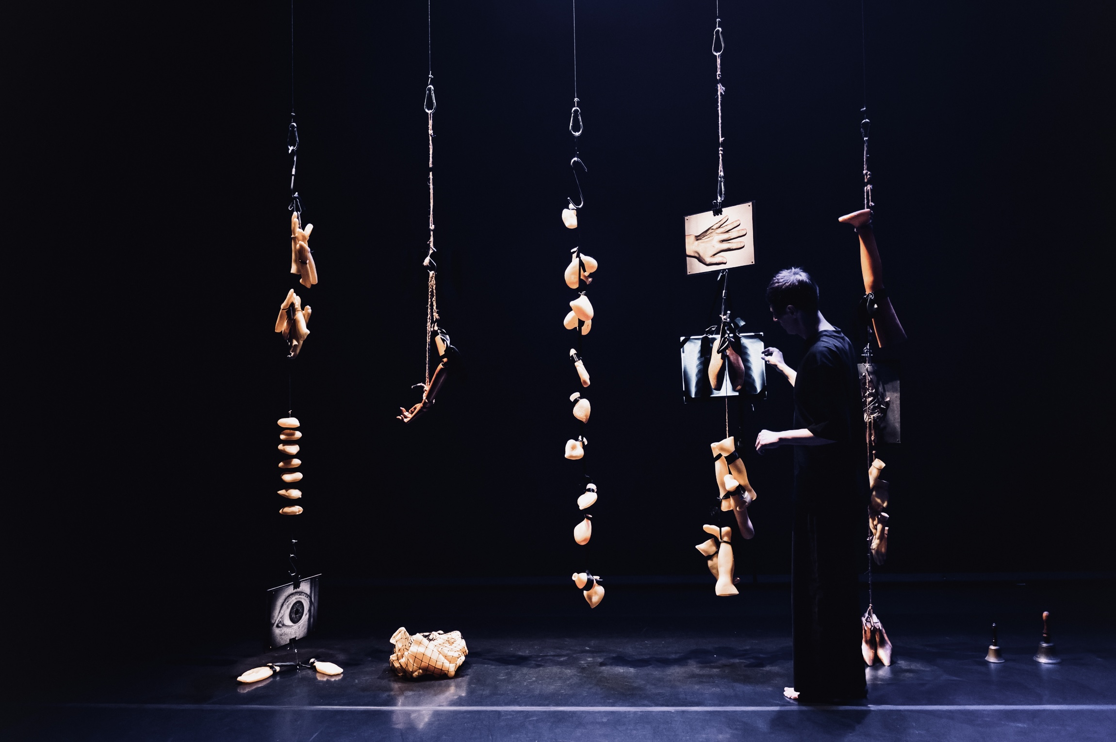 «Beltenebros» plantea la reinterpretación de los síntomas del cuerpo disfórico, propio del tiempo que compartimos, a través de la práctica con exvotos anatómicos -representaciones de órganos en cera, madera y metal- y la instalación en el artefacto teatral de un particular juego del ahorcado, como marco de la acción y sus mesetas. Cada exvoto organiza con el sonido un acercamiento al cuerpo, una situación cinética. Un baile macabro.
