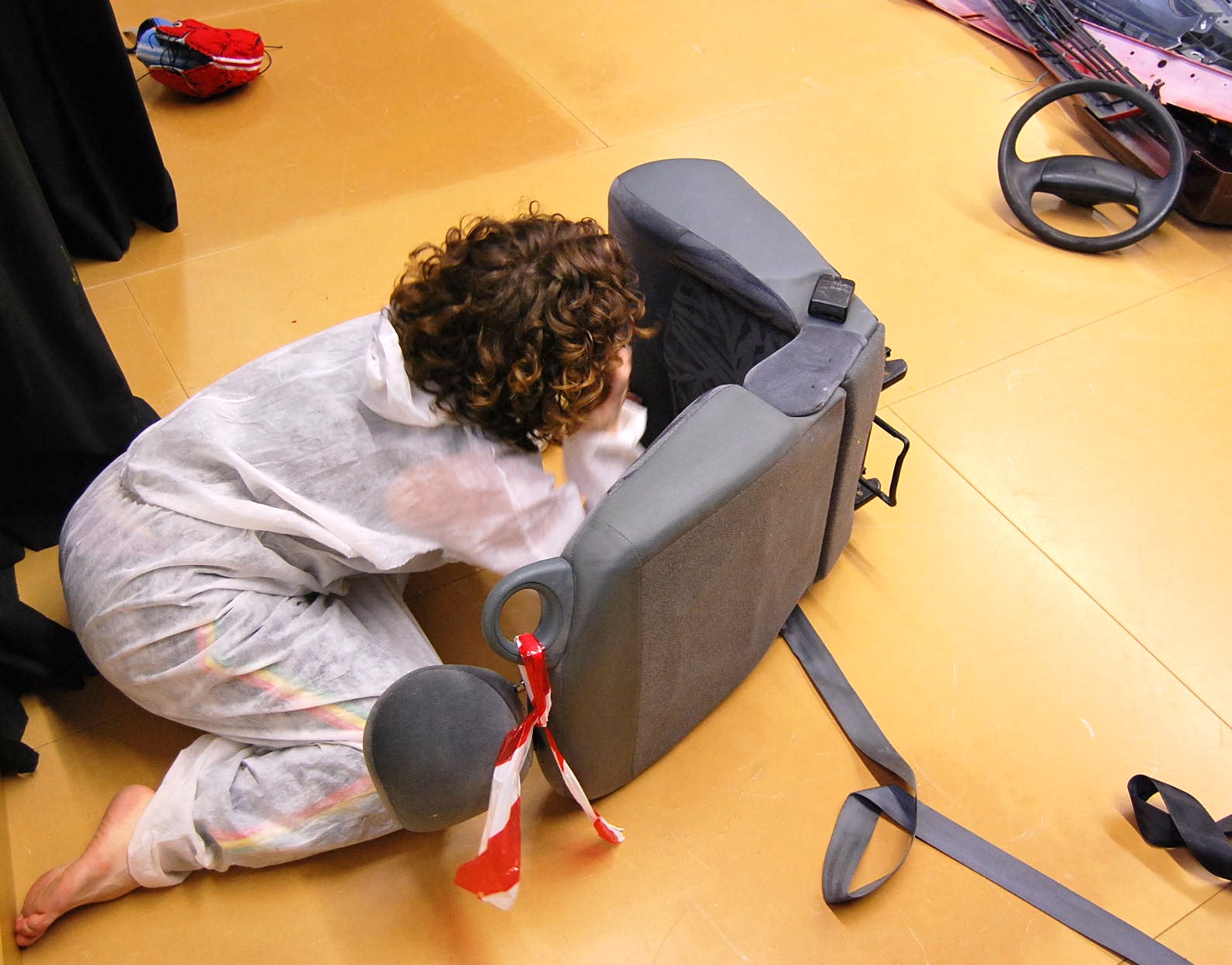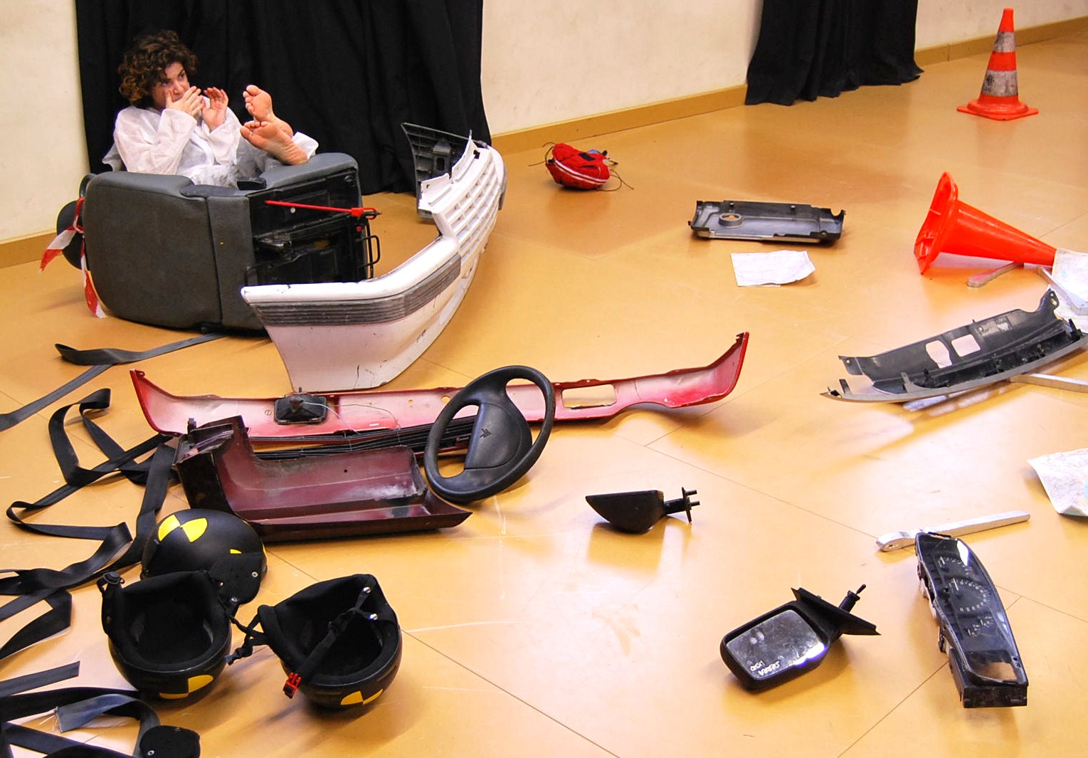 Canvi constant de vestuari i movibilitat de supervivència. Dòna voltes sobre sí mateix o fa petites el.lipses. S’amaga darrera del seient de cotxe o s’estira sobre els cascs negres de crash test.