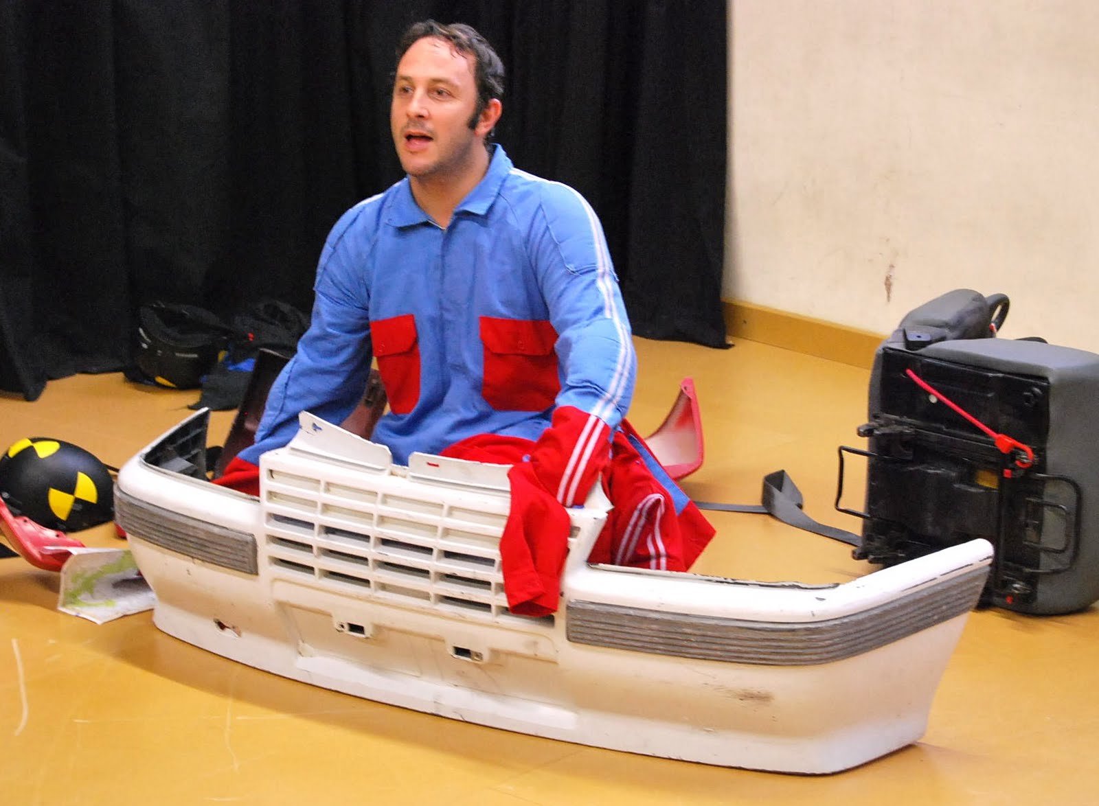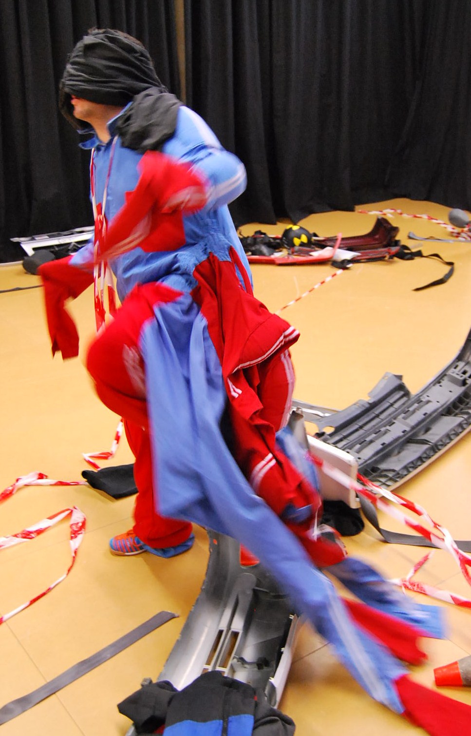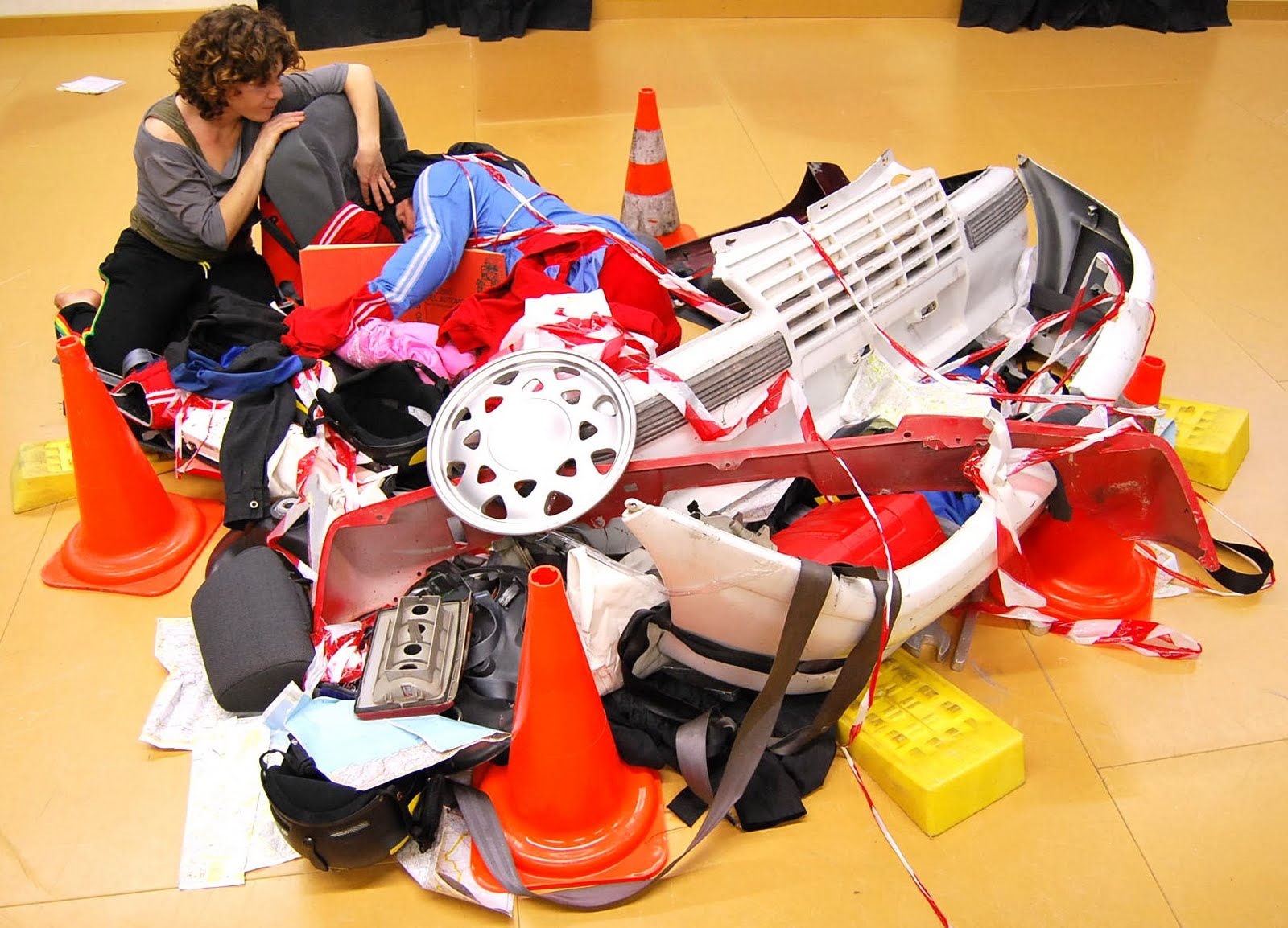 -Gallineta cega. Dins d’un qüadrilàter reduït on tots els objectes resten compactats com si es tractès d’una deixalleria delimitats pels conos i les cunyes. Oriol amb els ulls tapats per un mono negre intenta caminar o avançar sense gaire fortuna. Jaume li reclama que busqui el manual de l’automòbil. Mery el copilota i observa les seves caigudes. Lectura cega i desordenada.