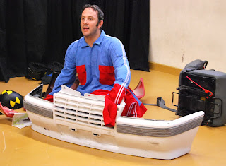 -Oriol, esgotat i esbufegant, es fa una prengunta sense resposta i la llença al públic: “Com es diu quan vols tenir un accident…?”