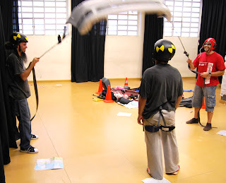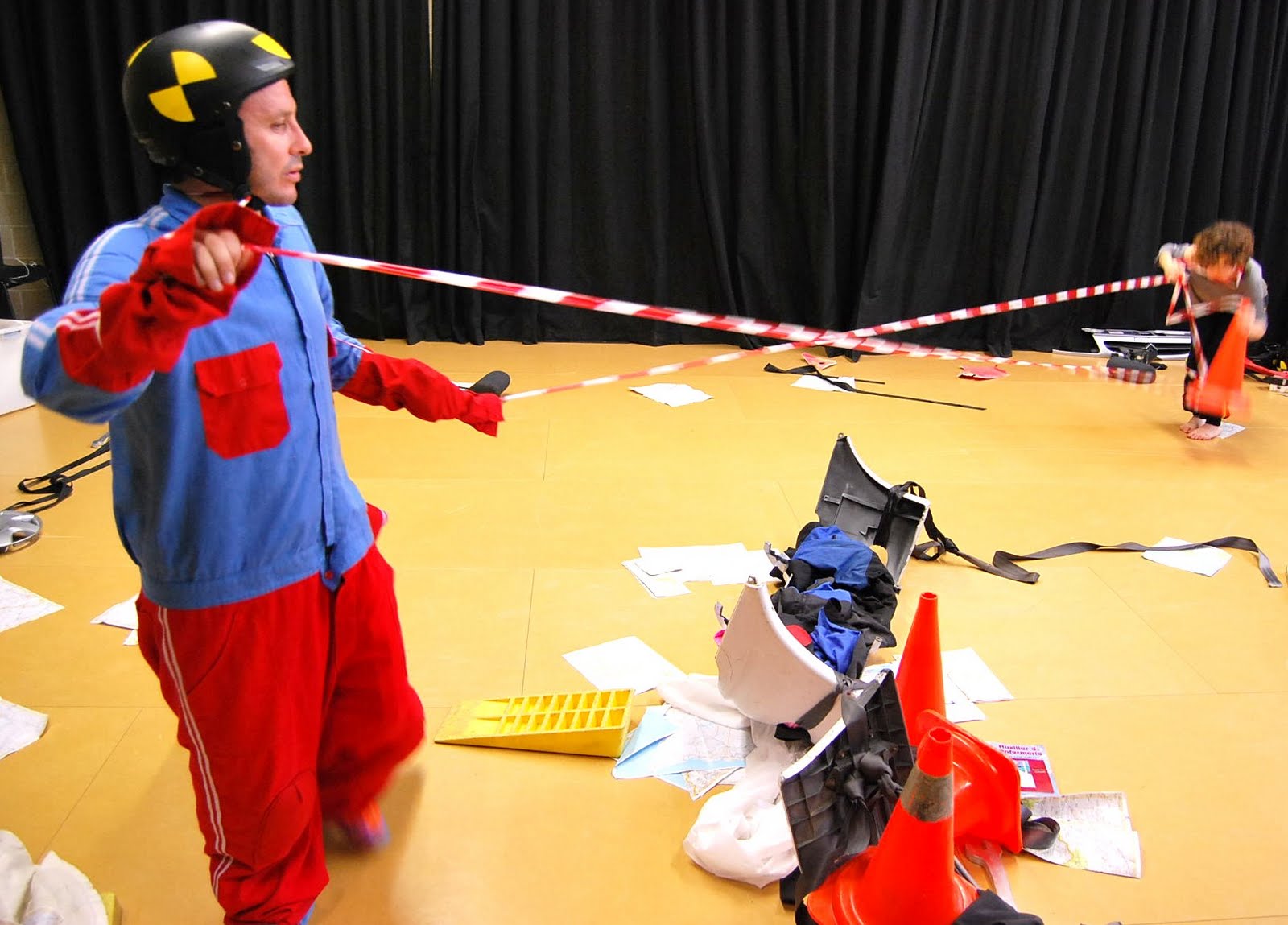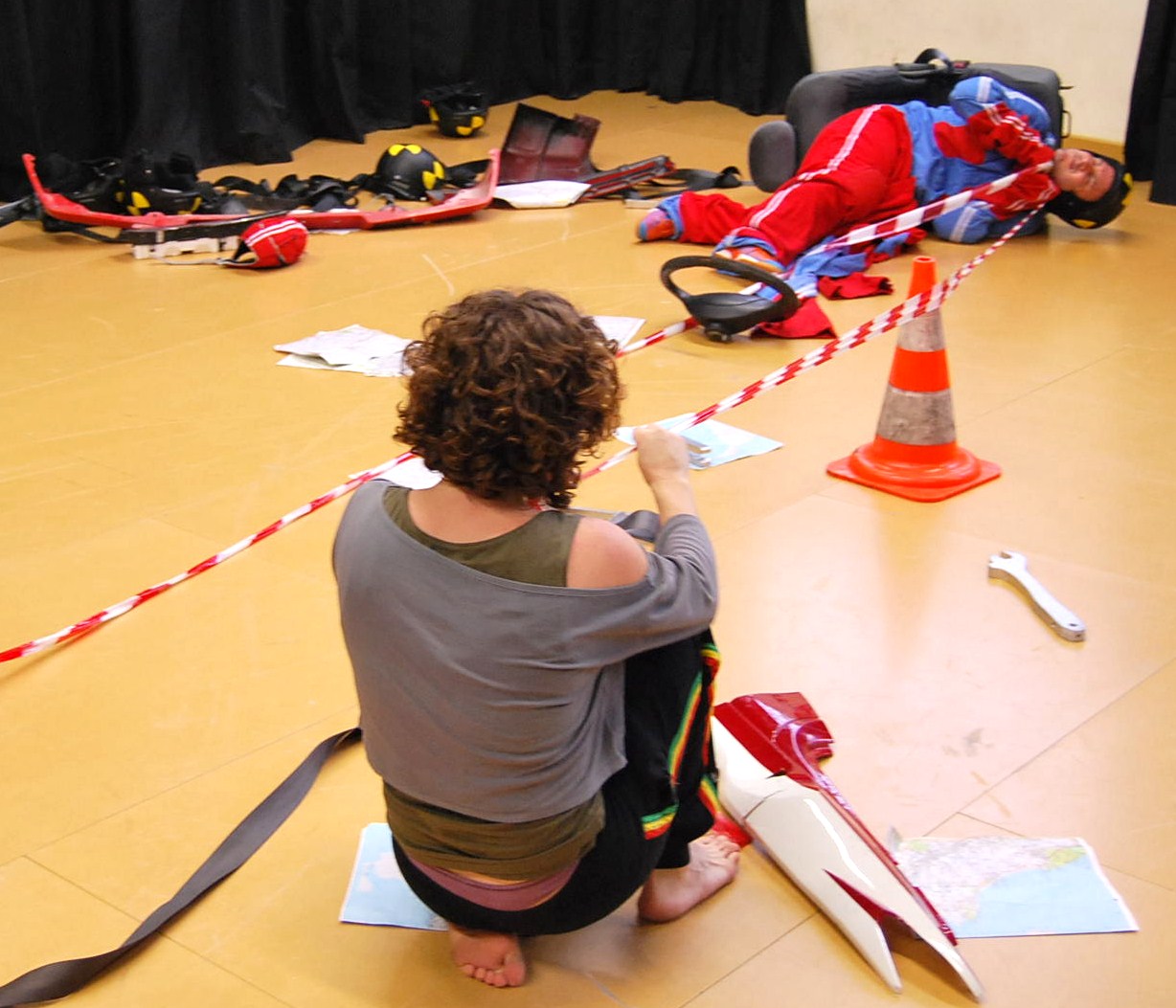-Xarxa amb cinta perimetral: atrapa al públic i el fa cómplice de les accions. L’escena creix i es dispara cap a l’espectador. Trampa que embolcalla els objectes i els fa retornar al seu punt d’origen. Agrupament/reordenació.