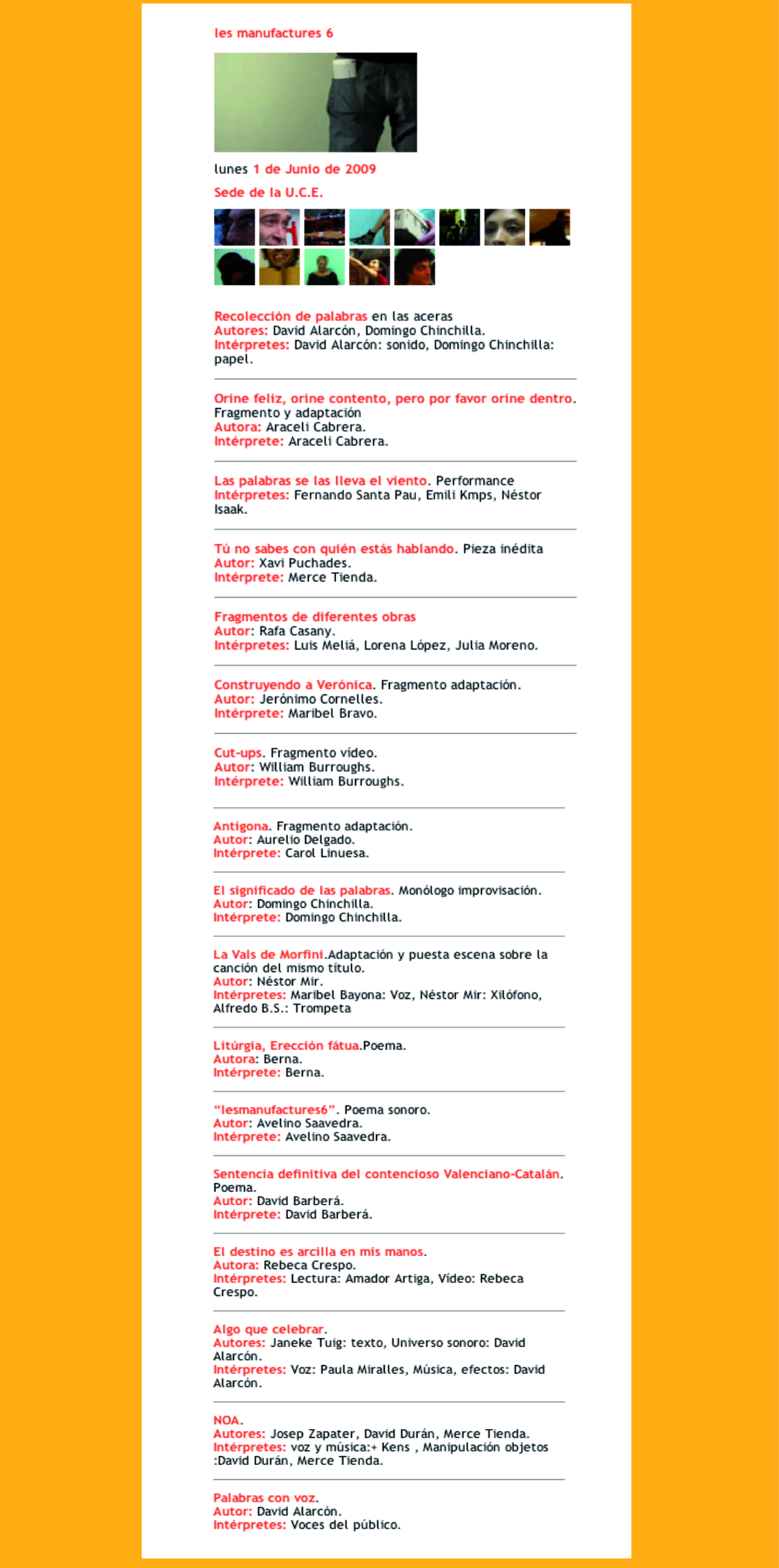 La sexta edición de les manufactures se celebró el día 1 de junio en la sede de la U.C.E. (Unificación Comunista de España). En principio parecía un lugar extraño, pero pensándolo bien, que mejor lugar que la sede de estos “expertos” en el arte de intentar convencer mediante la palabra para celebrar esta edición dedicada precisamente a La Palabra. Además, se utilizaron hábilmente los espacios que ofrecía este sorprendente local como escenario de las diferentes propuestas. Todo empezó con la recolección de palabras entre el público, perpetrada en la calle, ante la entrada de la sede de la U.C.E. Después vino la lectura de un texto en el pasillo del local y se pasó al comedor, donde se realizó una performance con participación de los asistentes y varias lecturas dramatizadas. Y terminó en el patio, al aire libre, dónde se celebraron el grueso de las propuestas: video, más lecturas dramatizadas, improvisación, grabaciones, música, poesía, etc. En definitiva, un repaso a los diferentes…