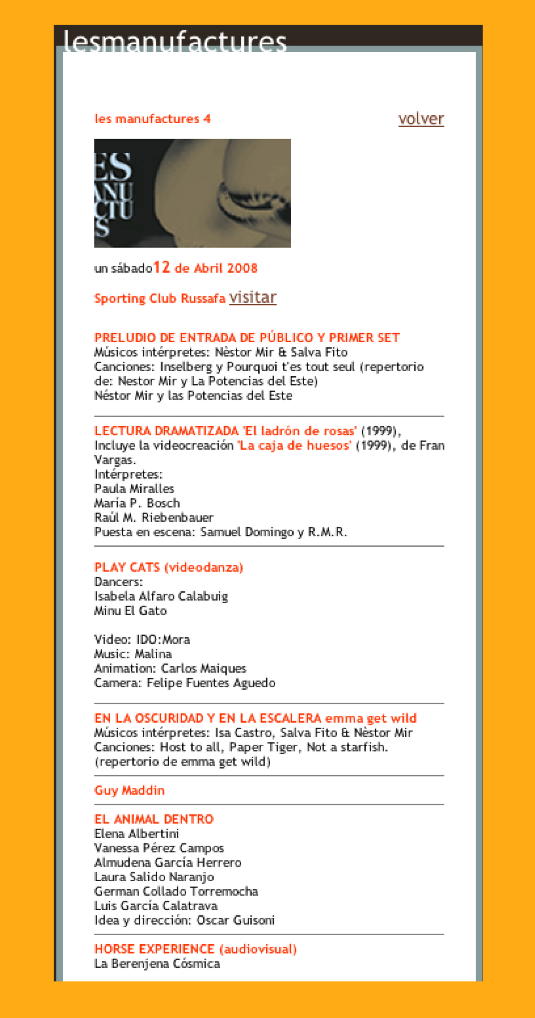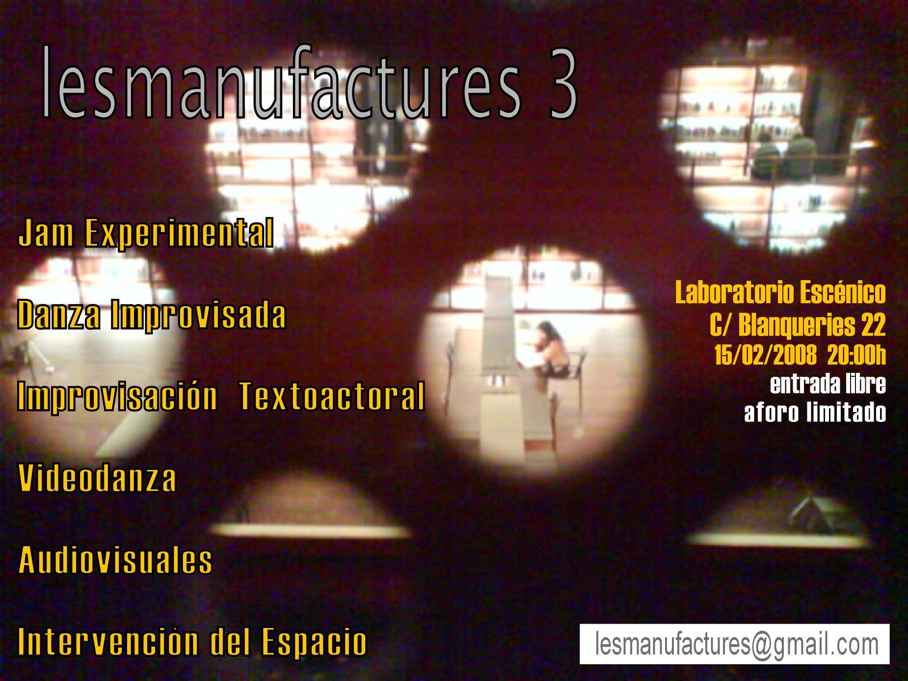 ya conocía les manufactures, me encanta la propuesta, estuve en la primera de La Carme Teatre -como contaba Marc- hace un año, también pude disfrutar de la que tuvo lugar en Sporting Club, soy seguidora vuestra y procuro arrastrar a mis amigos porque me parece genial. Pero el martes pasado…joder tíos! les manufactures se reinventó a si mismo. POR FAVOR QUE NO CESE, QUE NO SE NOS PRIVE DE ESTE PLACER!!!