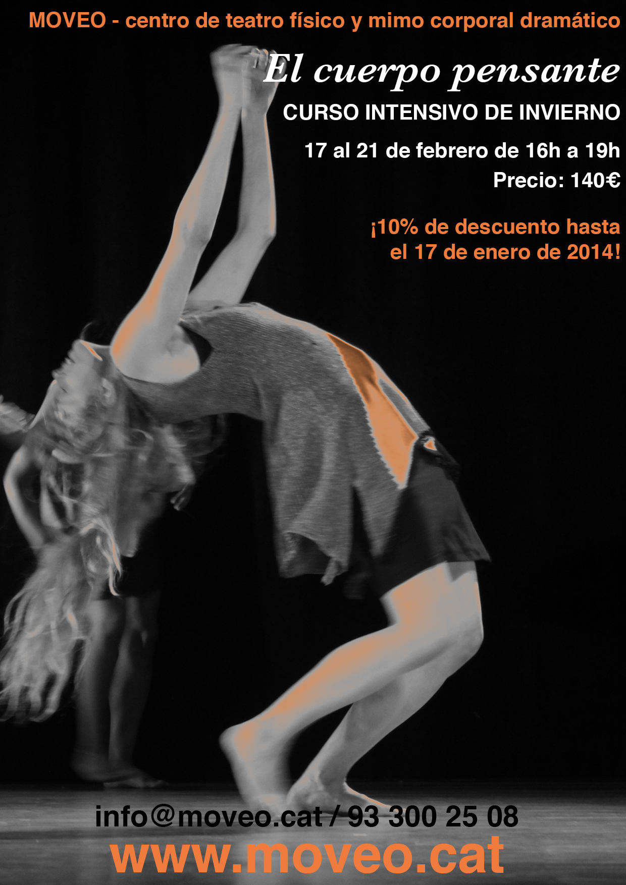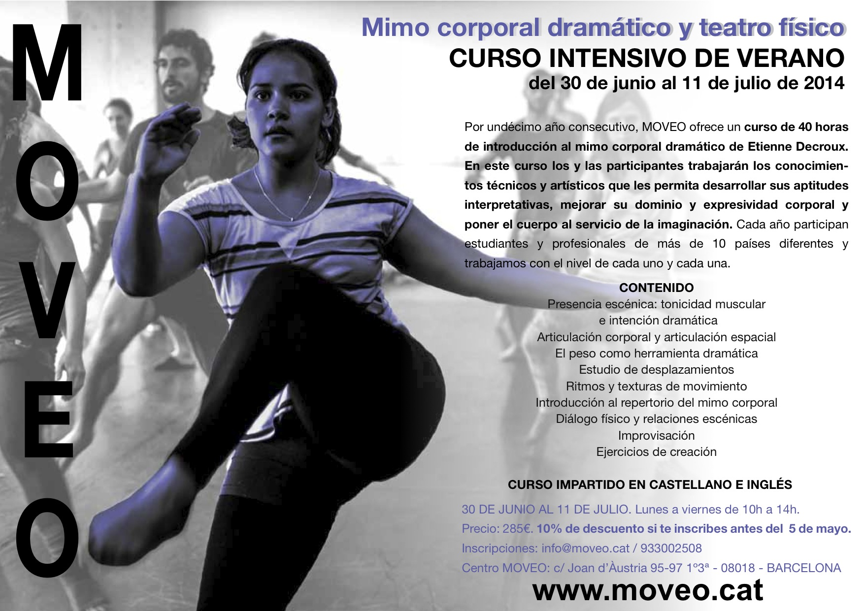 Por undécimo año consecutivo, MOVEO ofrece un curso de 40 horas de introducción al mimo corporal dramático de Etienne Decroux. Cada año participan estudiantes y profesionales de más de 10 países diferentes y trabajamos con el nivel de cada uno y cada una. En este curso, el alumno/a trabajará los conceptos técnicos y artísticos para mejorar su dominio y expresividad corporal, y desarrollar sus aptitudes interpretativas.