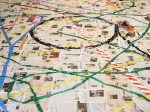 En un primer momento me centro en modelos geométricos que sirven para explicar estas otras maneras de entender la historia. Por ejemplo, el relámpago puede representar la concepción del tiempo de Walter Benjamín, la línea discontinua sirve para explicar la noción del tiempo en “Mal de archivo” de Derrida, el círculo puede representar el Eterno Retorno de Nietzsche, la sinusoide puede representar los altibajos de procesos cíclicos como la economía o una línea que se interrumpe de forma abrupta ilustra el concepto de tiempo mesiánico de Agamben. A pesar de que muchas de estas formas se mantienen en la performance, sin embargo esta parte teórica termina por convertirse en algo secundario.