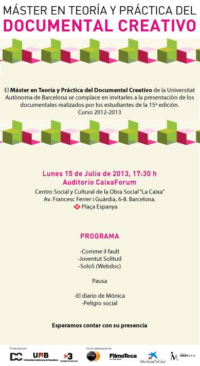 Tenemos el placer de invitaros el próximo lunes 15 de julio, a las 17:30h en el Auditorio de CaixaForum del Centro Social y Cultural de la Obra Social “La Caixa”, y antes de que se estrenen en televisión y en festivales, a la presentación de los documentales que durante el curso académico 2012-2013, han realizado los estudiantes de la 15ª edición del Máster en Documental Creativo de la Universitat Autònoma de Barcelona.