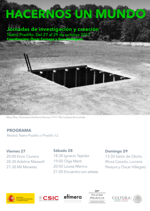 A lo largo de tres días, por medio   de una   serie de presentaciones y encuentros, vamos a estar compartiendo estas historias imposibles, pasados que son sombras y deseos para los que construir ese refugio temporal que es el teatro. Durante el viernes y el sábado se activarán una serie de propuestas que han resultado de la convocatoria pública de Efímera Revista para la elaboración de un número colectivo con el título “Hacernos un mundo, ficciones colectivas”. El sábado acabaremos la jornada con un encuentro abierto con los participantes donde conversaremos en torno a la cuestión “¿Tiempos para habitar?” a través de las distintas propuestas, sus mundos de referencia, formas de creación y espacios imposibles. Finalmente el domingo terminaremos con la celebración de un Salón que nos invitará a ocupar un espacio y un tiempo en los que abordar este tema desde lugares imprevistos como la física, la gastronomía, la educación o el paisaje.