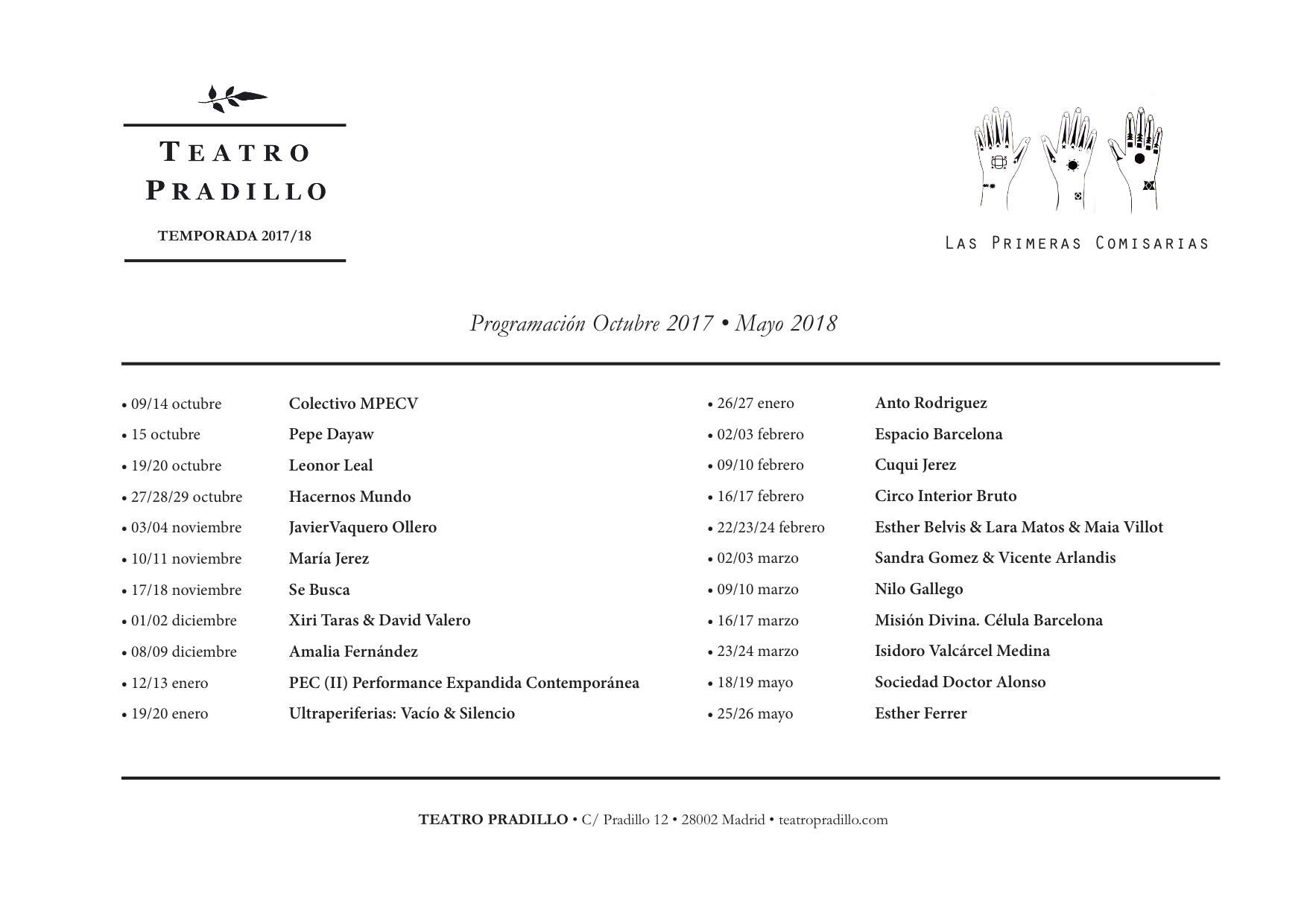 En abril de 2017 el Teatro Pradillo cambia de gestión. En esta nueva etapa el equipo directivo nos encarga la curaduría de la temporada a Diana Delgado-Ureña y Jaime Vallaure. Proponemos hacer extensivo el trabajo a Itxaso Corral como artista residente en Barcelona, con la intención de incluir criterios, experiencias y modos de hacer de artistas que trabajan en contextos fuera de la ciudad de Madrid.
