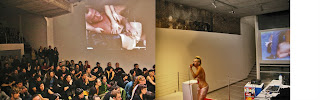 Eva, de Gender Jockeys, hizo la primera presentación con el estreno de una joyita poética y la vez sencilla, casi un haiku, Porn Ceremony. Luego Fran hizo lo que mejor sabe hacer, que es poner los puntos sobre las íes en cuestiones de políticas de difusión y otras leyes fascistas. El metraje de los actores de su largo nos dejó a algunxs asintiendo obedientemente durante un rato. Es lo que tienen los pollones de 12 cm. Eso hasta que, tras idas y vueltas, salió la Pornoterrorista, Diana Junyent. Qué bonito, qué maravilloso. No sabía hacia donde dirigir el objetivo de la cámara, si hacia Diana o hacia las fantásticas expresiones de horror y morbo que había entre los asistentes. Diana recitó todos sus grandes éxitos, hizo que Majo, de las Post Op alguna sorpresa del coño (y de paso aprovechó para que le haga un puñito rápido), arrancó un «¡Eres cojonuda!» de su padre, que encontraba entre el público y se dejó disciplinar por un ser que tan sólo con su actitud marcial y sus maneras chulescas me dejó sin habla (bienvenida a mis futuros sueños mojados, dj Sophie).Se echó de menos la garra y ganas de expresarse que lució el público de La Revuelta Obscena I. Pero dicen que a todos los hijos se les quiere por igual, aunque todos sabemos que no hay nada más falso.