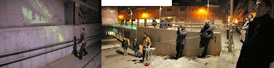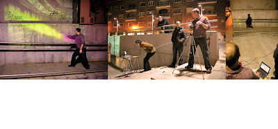 Probando el Frontón Virtual desarrollado en openframeworks por Yago Torroja, en la entrada del Medialab Madrid, el día antes de la acción reivindicativa para salvar al Beti Jai.