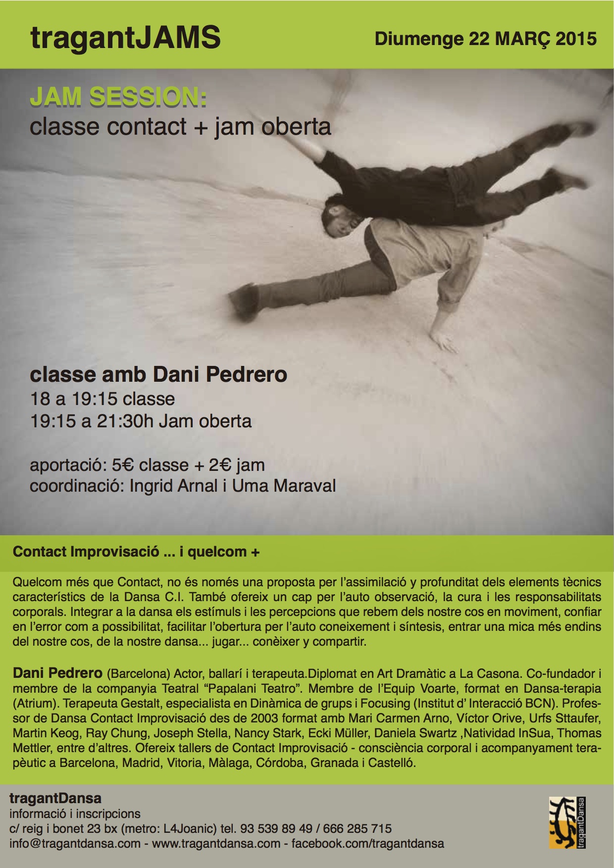 Relacionarem això amb el treball del teixit conjuntiu (fascia), i utilitzarem l’elasticitat del nostre cos per arribar a una dansa física i acrobàtica, amb un mínim d’esforç. A través d’una afinació del nostre cos/ment, un treball lent i profund, i d’exercicis detallats, avançarem cap a una improvisació en contacte, jugant, ballant, volant, ‘jamming’.