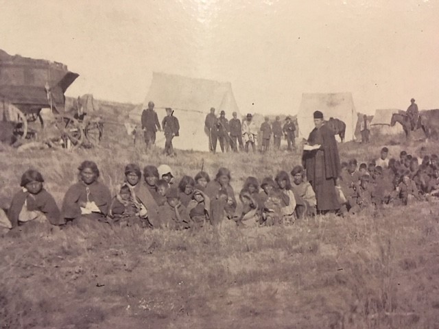 Llegan los indios prisioneros con sus familias a los cuales los trajeron caminando en su mayor parte o en carros, la desesperación, el llanto no cesa, se les quita a las madres sus hijos para en su presencia regalarlos a pesar de los gritos, los alaridos y las súplicas que con los brazos al cielo dirigen las mujeres indias. En aquel marco humano los hombres indios se tapan la cara, otros miran resignadamente al suelo, la madre aprieta contra el seno al hijo de sus entrañas, el padre indio se cruza por delante para defender a su familia de los avances de la civilización. [subratllat meu]