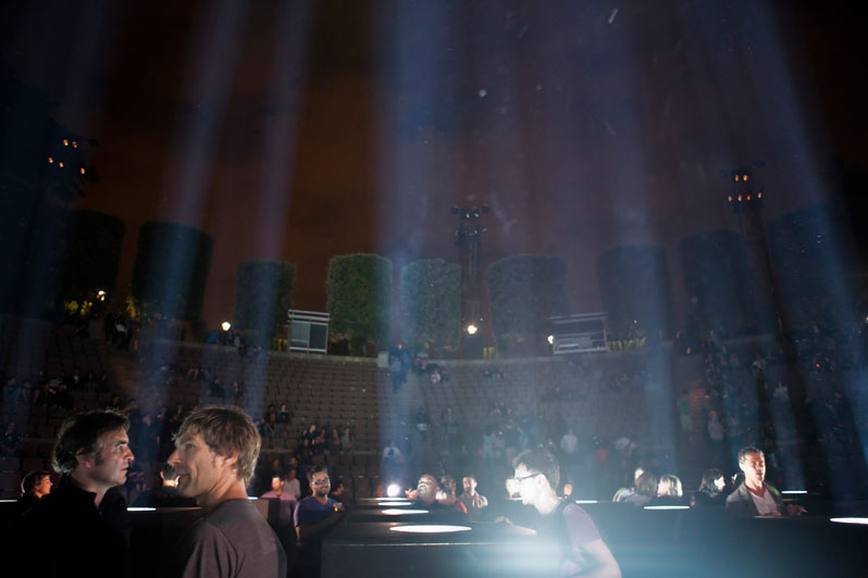 Yo estaba deseando que llegara un momento de complicidad coreográfica colectiva entre el público que jugaba con las luces de la instalación Spectra en el Grec anoche, tapando determinados focos a la vez, para crear la sombra mágica de un murciálago, envíando una señal superheroica, a través de la noche, desde Montjuïc hasta el cielo infinito.
