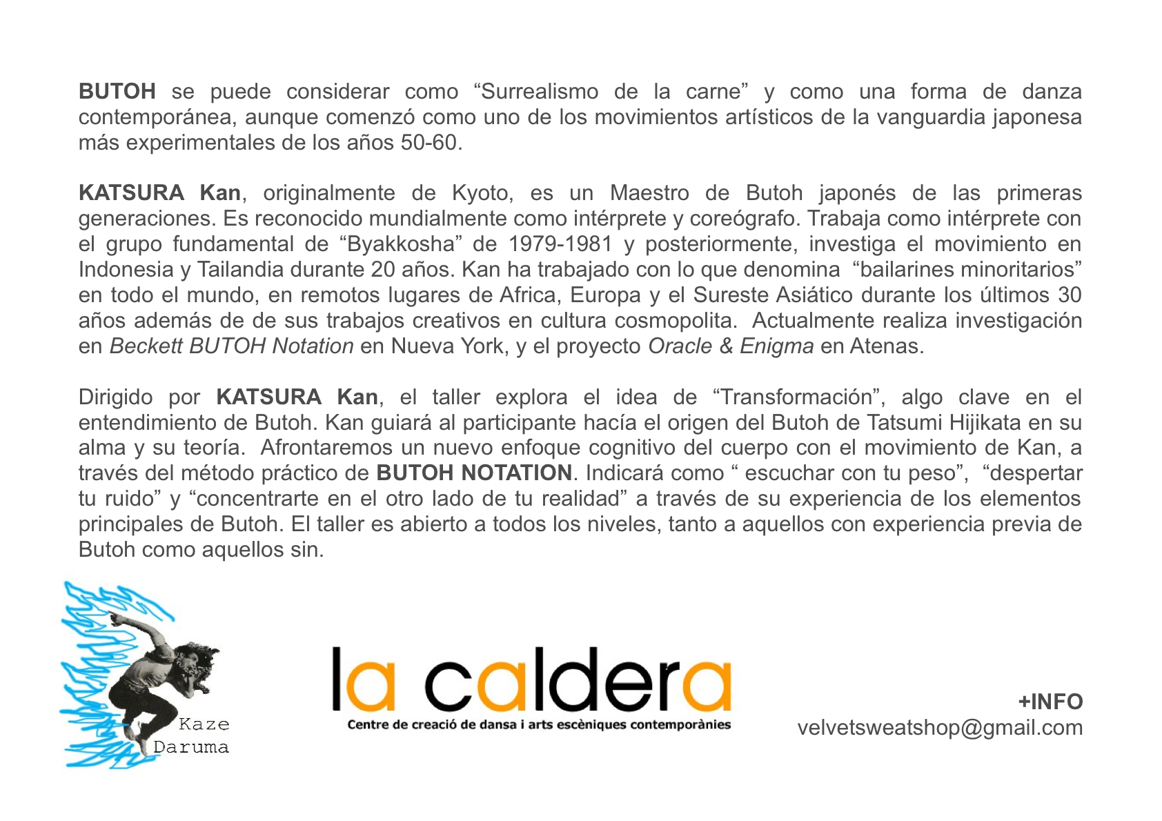 Es mi enorme placer poder volver a trabajar con mi antiguo maestro, el genial científico del movimiento, Katsura Kan, que vuelve a impartir taller en Barcelona este invierno. Creo que es la persona con más conocimiento académico sobre el Butoh, aplicado al dominio del cuerpo en crisis que camina sobre este planeta.