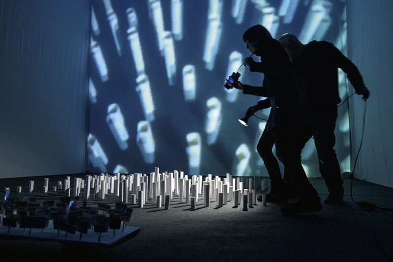 Imagínate un plató donde dos performers desarrollan una historia utilizando una cámara de video, una linterna y varias paredes donde proyectar lo que se graba en directo. Imagínate que además le incluimos animaciones generadas por ordenador, algo así como dibujos animados con una estética cercana a la ciencia ficción y al cómic.