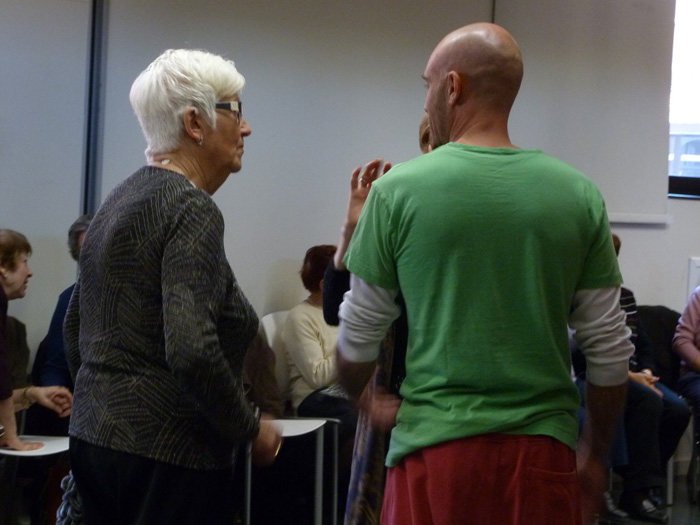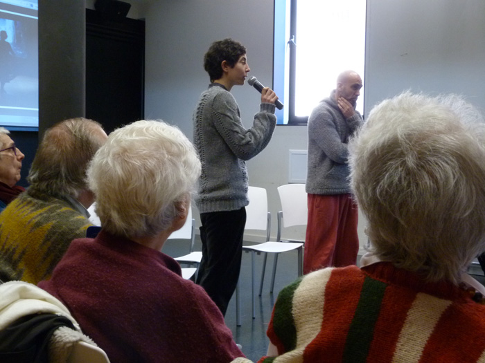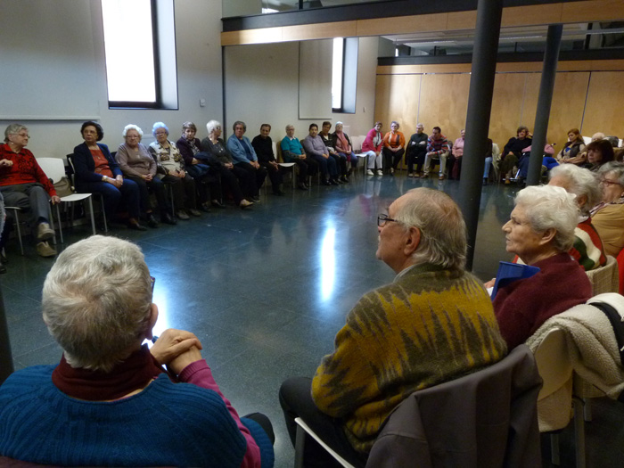 La charla, muy informa, se plantea con todos y todas las participantes (mayoritariamente), situados en círculo, en una sala del Convent de Sant Agustí. Después de una pequeña presentación y muestra de fotos del taller, se ponen en práctica alguno de los ejercicios que hacemos habitualmente en el taller, los martes. Cada uno según sus posibilidades, realiza los movimientos, respiración y finalmente, los movimientos de danza, a un ritmo suave y adaptado a las condiciones de los participantes; y tomamos conciencia de la respiración y de la movilidad propia del otro (con ejercicios por parejas).
