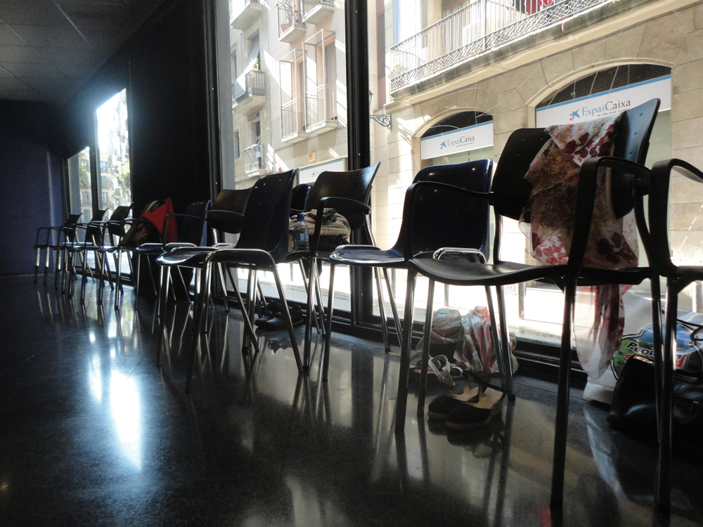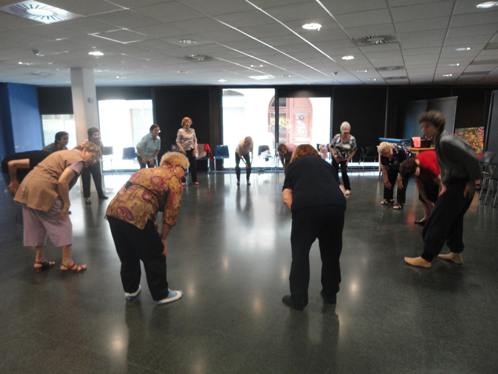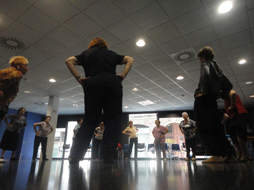 El sol se refleja por la ventana de la sala del Covent de Sant Agustí, y se ve la gente pasando por la calle (no mucha, no es una calle especialmente transitadas, solamente por la gente del barrio) yendo a comprar, a recoger los niños a la escuela… Esta hora y media a menudo resulta un paréntesis necesario en su dia a dia que transcurre plácidamente entre la música, el reflejo de la luz por la ventana y los movimientos de los cuerpos.
