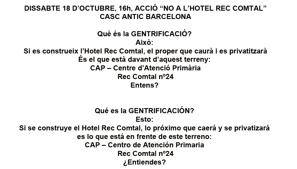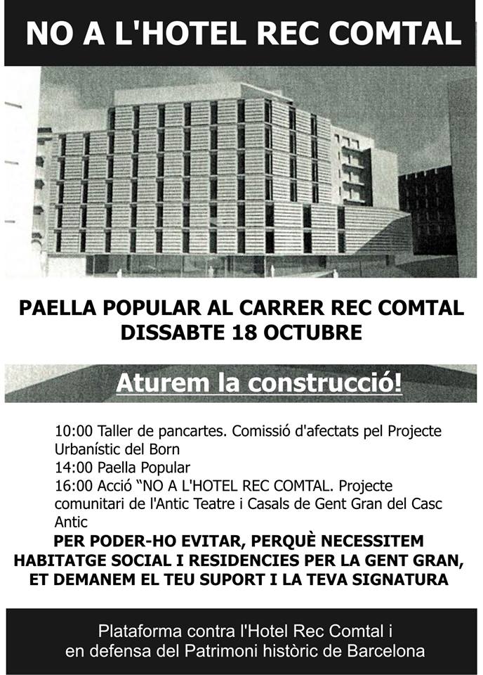 18/10 CONVOCATÒRIA ACCIÓ REINVINDICATIVA: NO A L’HOTEL REC COMTAL I REIVINDICACIÓ PER LA RESIDÈNCIA O ESPAIS DE SERVEIS SOCIALS I CULTURALS PER LA GENT GRAN DEL BARRI