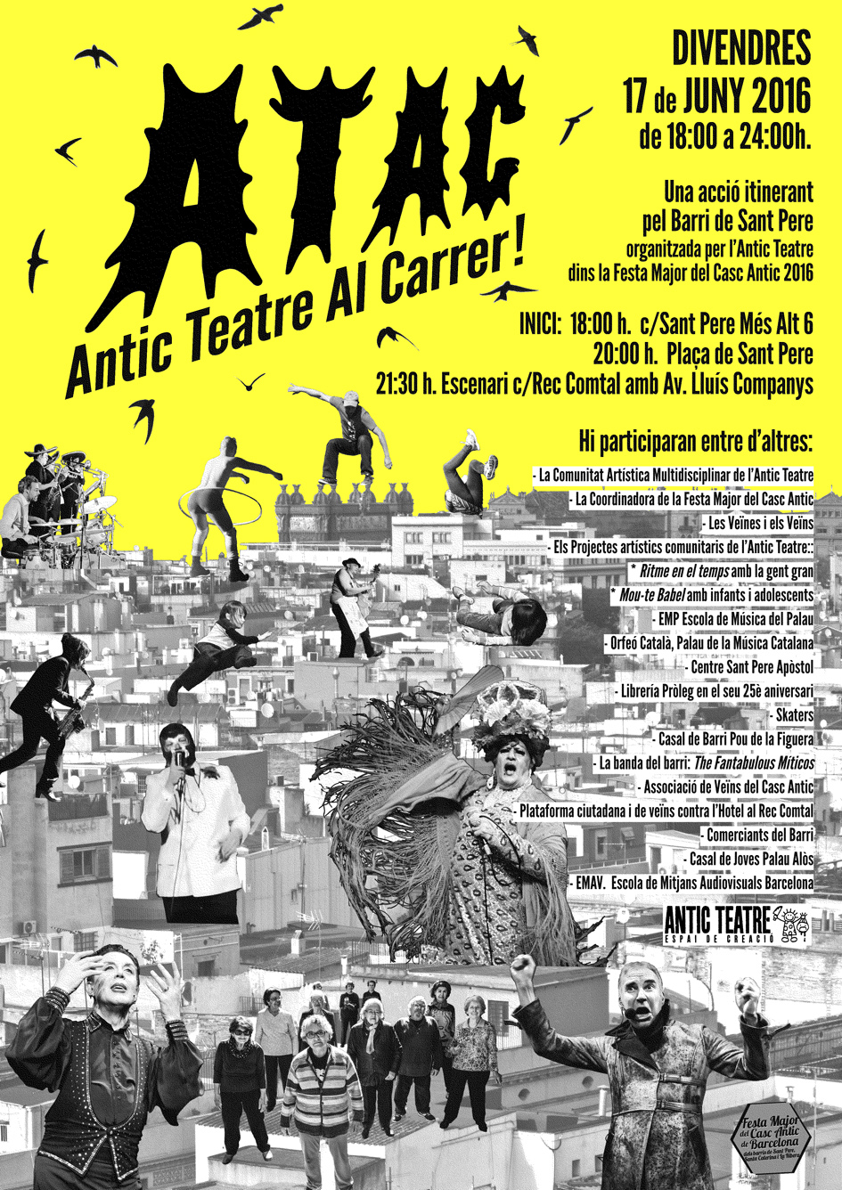 A.T.A.C. Antic Teatre Al Carrer és una acció itinerant pel Barri de Sant Pere, Santa Caterina i la Ribera organitzada per l’Antic Teatre dins la Festa Major del Casc Antic 2016
