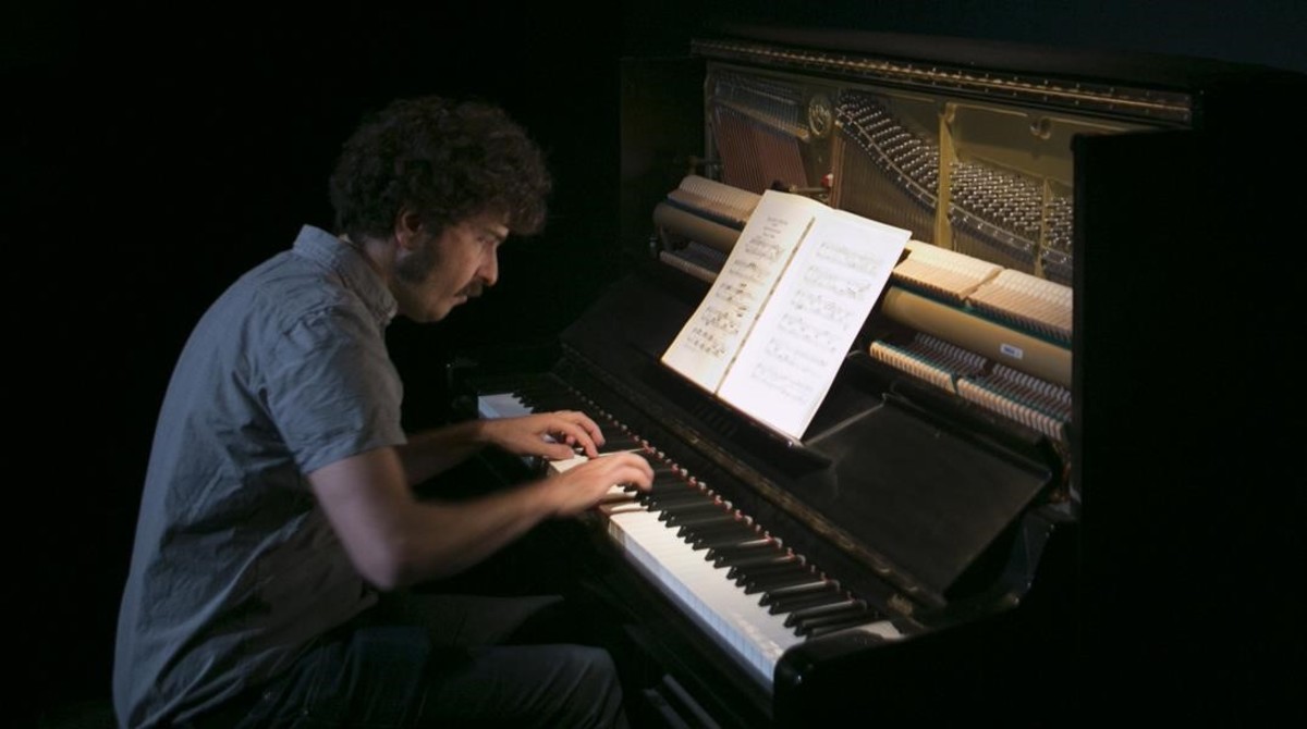 En la pared aparece proyectada una frase. Parece que pone «La música es como una droga dura». Y luego, otra, también borrosa. Y otra. Desde las gradas no se leen nada bien, de modo que, en un gesto inviable en cualquier teatro convencional, la mitad del público se levanta, baja por las escaleras y se sienta en el suelo del escenario. Desde aquí se lee algo mejor. Y el piano está más cerca. De algún modo, el ceremonioso espacio teatral se ha transformado en una habitación al fondo de la cual un tipo toca de espaldas a nosotros. Sin más.
