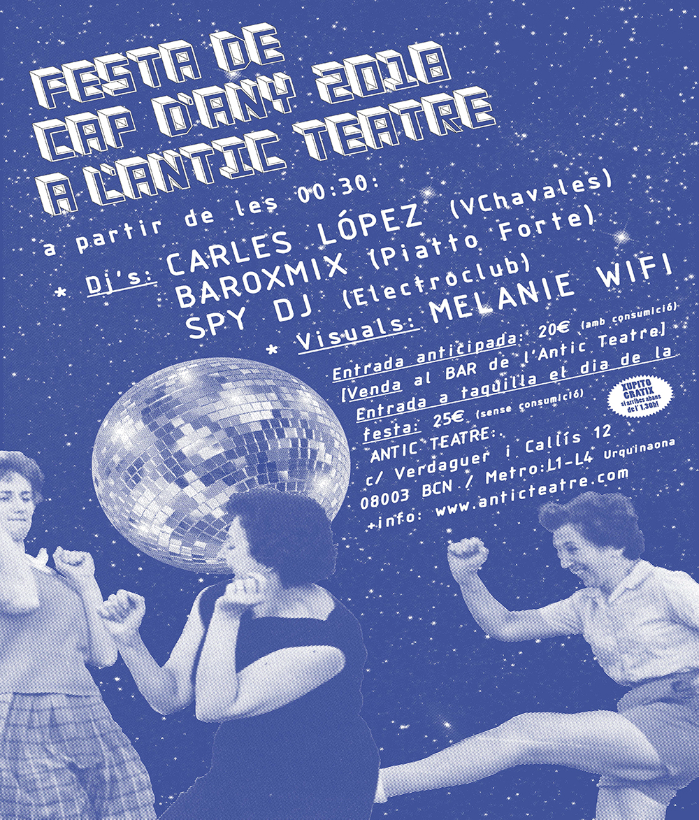 El 31 de diciembre el centro de Barcelona se moverá a ritmo de música electrónica desde Antic Teatre, de la mano de los Djs Carles López (VChavales), Dj Baroxmix (Piatto Forte), Spy Dj (Electroclub) y acompañados por las visual sessions de Melanie Wifi. Se trata de la 14a edición de esta ya mítica fiesta de Fin de Año en la ciudad.