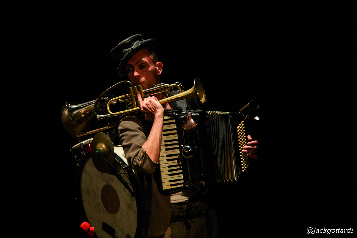 Un músico entra, se viste y se carga de instrumentos. Multiinstrumentalista y malabarista de ritmos y melodias. Grandes clasicos del Jazz, folklores varios y temas propias van siendo maltratados por un peculiar personaje, obsesionado por tocarlo todo a la vez, y en una constante lucha para lograrlo. Puede ser inevitable que los instrumentos a veces tomen el control.