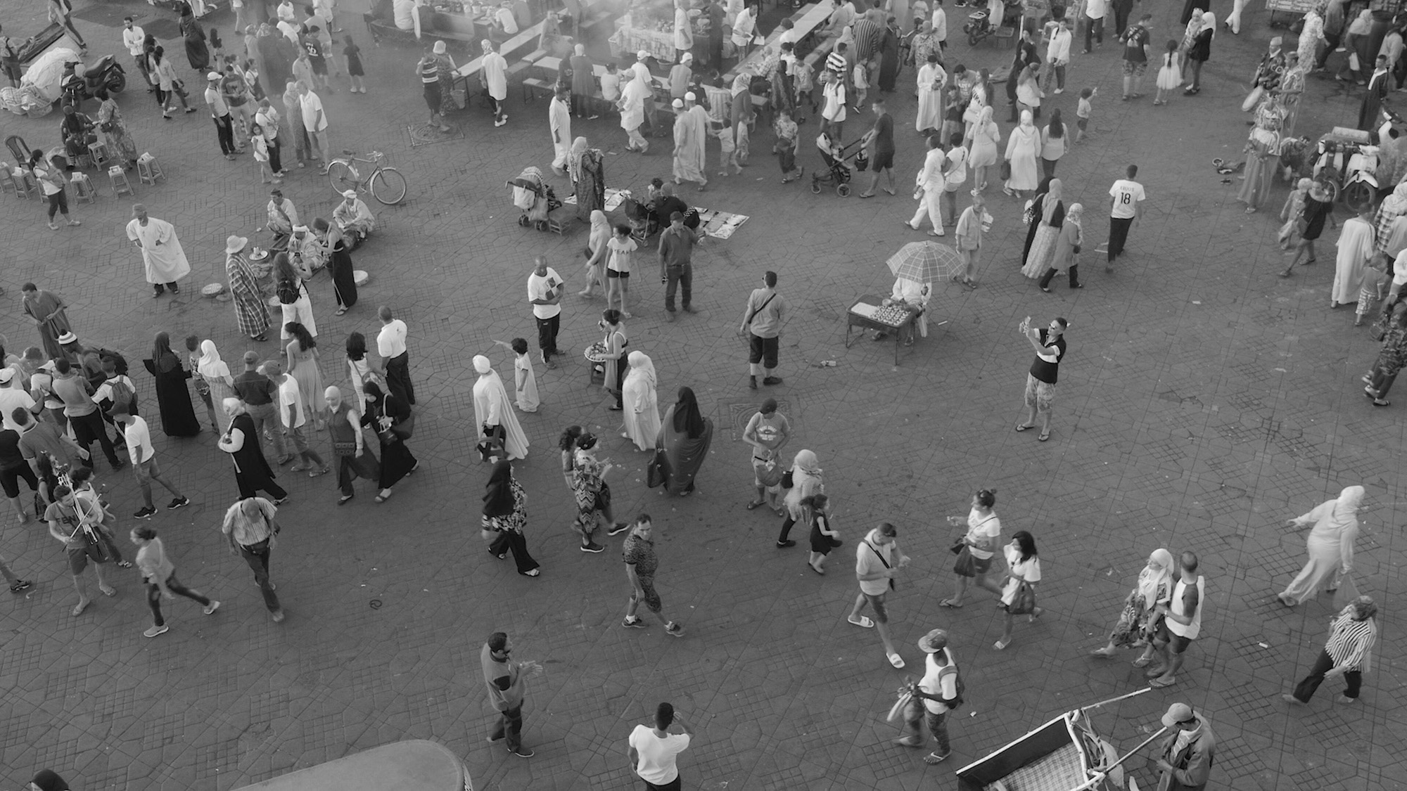 En la plaza Djeema el Fnaa en Marrakech (Marruecos), burbujas sobrevuelan y se dispersan a través de la masa de personas reunidas. La cámara actúa como un intruso y desvela diferentes situaciones protagonizadas por locales y/o extranjeros. El espacio de cada individuo se pone en contraste y es revelado.