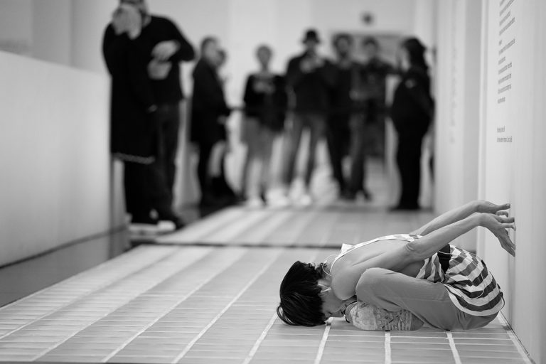 Documento/a – Expuesto en el culo de un desgraciado. Las imágenes de un loco, un masoquista y un artista conceptual, me sirven de justificación para hablar de inspiración y apropiación, de la estética o patrón de una desgracia que, reflejada fuera de contexto, ofrece un bonito cuadro, placer fetiche o acción. Lo último que digo en la pieza, y que no es el final de lo que hago, «Aunque yo sea pobre mi pensamiento es burgués, bueno, casi burgués, y esto es así porque un coreógrafo no puede ser proletario”.