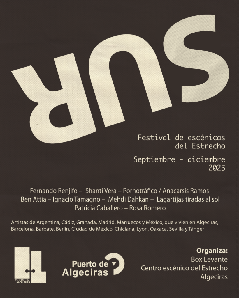 SUR. Primer Festival de artes escénicas del Estrecho, este otoño, en Algeciras. Nueve artistas o colectivos artísticos, seis de ellos en residencia. Unos vienen de muy cerca, otros de muy lejos. Tres de ellos vienen de México. Algunas obras acabadas y varias puestas en común de procesos de trabajo, otra manera de acercarse a la creación escénica contemporánea. Danza, teatro, performance, instalación, conferencias performativas, acciones…