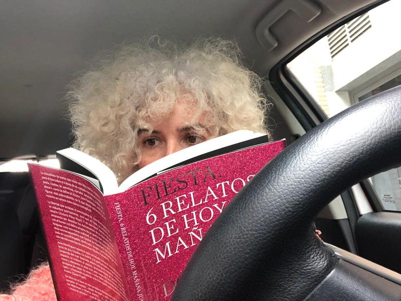 Imagen: Maria Jerez leyendo FIESTA. 6 relatos de hoy, mañana, Juan Domínguez y pasado mañana, editado por Caniche Editorial