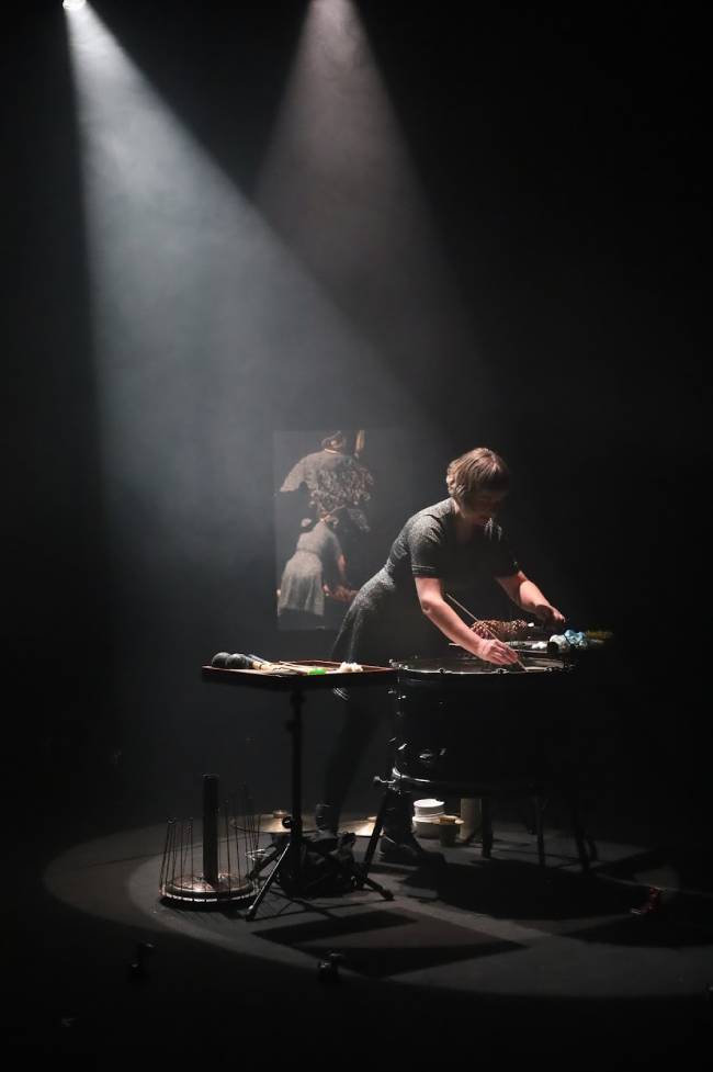 La oscuridad es brillante como el fuego nos dice la hechicera Marianne Faithfull, y Núria se asoma a un caldero con forma de tambor, al círculo mágico donde va vertiendo todo tipo de ingredientes: huevos de plástico, canicas, platillos, tazas y piñas… Y todos ellos se confunden en el mismo caldo que ella no deja de remover y remover… y cuyo borboteo, el público escucha. Tot fa brou y la puesta en escena que se va construyendo es una íntima correspondencia entre el trabajo en el back de Roc Mateu que es precioso, y que constituye a la vez: el paisaje, the hilltop where the two roads meet, el lugar de encuentro físico de las brujas y un espacio de memoria, compuesto por muchos estratos.