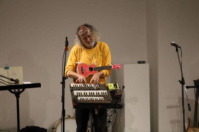 Iván Telefunken en Mira que em va escriure Joan Brossa!, aparece con los ojos heterotópicos pintados en su frente. Como una pintura románica. Como los ángeles de Santa María d’Àneu: las alas llenas de ojos, la frente llena de visiones, ojos de araña. Argos el ciego. Los ojos de Iván son ciegos, pero están bien abiertos. Con ellos, ¿qué vigila? Tres o cuatro hileras de ojos que miran al público cuando el artista baja la cabeza para tocar sus teclados.