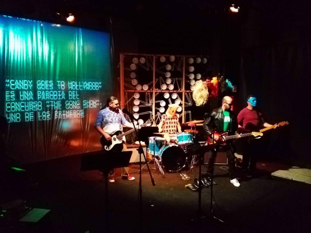 “El espectador lleva ventaja: no paga un precio alto y no corre riesgos. Puede reconstruir, explicar y revivir sus momentos favoritos. Puede dilatar y amplificar los recuerdos ajenos […] Forzar las referencias, las derivas, los escenarios y las personas. Rescatar una actitud antes que una época. Y narrarlo todo. En un relato”. Ese relato es el de cómo la artista catalana Sindria Segura, un 30 de octubre de 1985, le roba la peluca a un impávido Andy Warhol aprovechando una firma de libros en la librería Rizzoli de Nueva York; historia que sirve de nexo de unión del libro de Torres y que en la adaptación teatral de Marc Caellas desaparece, en beneficio de una utopía que pasa por encima de la vida, que es un sorpasso. La vida entendida –para Caellas– como el riesgo de desnudarse y exponerse, sin saber qué pasará después. Un mostrarse televisivo, en un modo híbrido entre La edad de oro, de Paloma Chamorro, y el programa TV Party, conducido por Glenn O´Brien y Chris Stein (Blondie), que se emitió en el canal de cable de Nueva York desde 1978 hasta 1982. Igual que allá, en la adaptación teatral una banda de música instrumental (al estilo de la de Walter Stedin) sirve de acompañamiento musical (Los Tentáculos), con ritmos rockeros y el proto-punk del legendario Link Wray.”