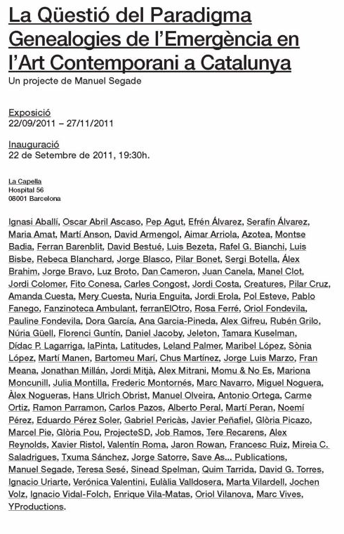 L’exposició titulada “La qüestió del paradigma. Genealogies de l’emergència en l’art contemporani a Catalunya” pretén mostrar el present de l’art contemporani al territori català. Per fer-ho, el comissari de la mostra Manuel Segade ha resseguit l’escena catalana a través d’exposicions, convocatòries i iniciatives diverses tant públiques com privades, amb l’objectiu d’establir una sèrie de genealogies que construeixen ponts entre artistes de generacions diferents que, en conseqüència, marquen camins preestablerts per als creadors emergents. Amb aquest objectiu, també s’estableixen diferents àmbits en l’espai expositiu per mostrar l’estat del desenvolupament de l’escena catalana actual. Aquests àmbits depenen de múltiples condicionants que han articulat –i segueixen articulant– el panorama artístic català, tant des del funcionament del propi sistema artístic (exposicions, convocatòries, joves comissaris, etc.), com des d’aquells trets fonamentals que condicionen la creació catalana avui (sistemes de producció, processos, narracions, edicions, noves iniciatives expositives, etc.).