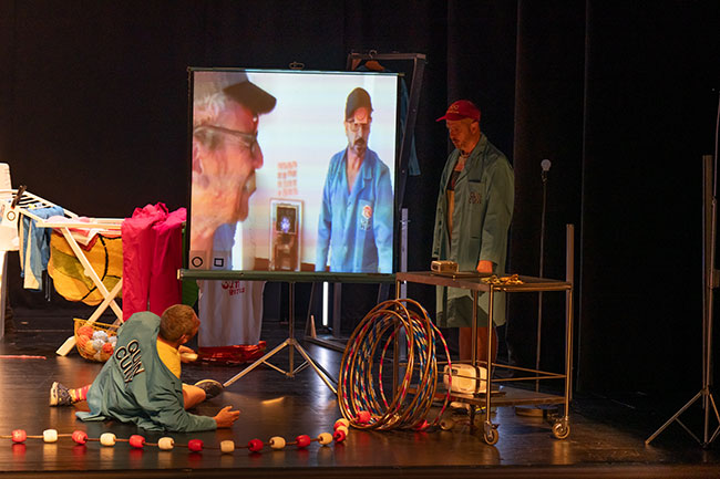 El duo de clowns metafísicos formado por Juan Loriente y Oscar Gómez Mata dicen que son “detectives de lo real”, cuya misión es buscar lo sensible bajo lo sensible. Dos detectives de la realidad que también son dos poetas de la escena que llevan 25 años de búsqueda. En su última pieza, que firman bajo el nombre de Compagnie l’Alakran, parten de la confianza. Creen que hoy en día es cada vez más difícil confiar en nada y en nadie. Dudamos de lo que vemos y de lo que oímos. No podemos estar seguros de que dos personas, puestas en paralelo, vean lo mismo. ¿Lo que vemos nos da una imagen de la realidad? Vemos algo, pero en realidad no sabemos lo que vemos.