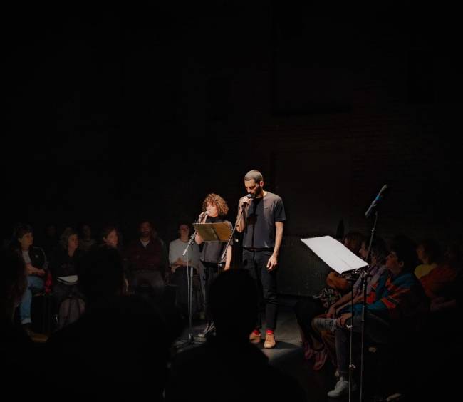En una reciente correspondencia que se prolongó durante varios meses, la pareja intercambió reflexiones, anécdotas cotidianas, lecturas, poemas, grabaciones de canciones y recitaciones. La performance actúa como un trabajo activo de selección, recuerdo, recreación, reestructuración, reevaluación y reensamblaje de elementos de la correspondencia, como una forma de lidiar con un momento histórico trascendental caracterizado por una escalada en el constante zumbido de la violencia genocida que ha estructurado las respectivas trayectorias de los artistas.