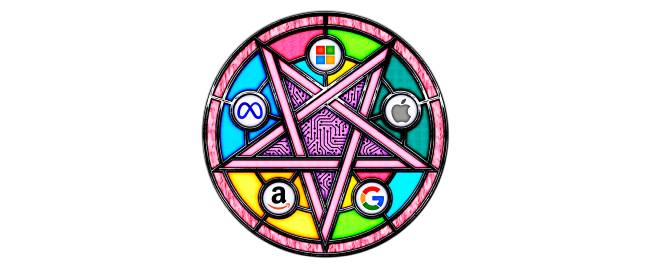 “Comulgad y aceptad los TÉRMINOS Y CONDICIONES de los himnos corporativos de este TOP 5 de reinos cibermedievales con mayor capitalización bursátil. MICROSOFT, META, AMAZON, GOOGLE Y APPLE [MMAGA]. Pues son ellos nuestros señores tecnofeudales y nosotres, sus vasalles, les USERF, sembramos sus plataformas con nuestra data-blood.”